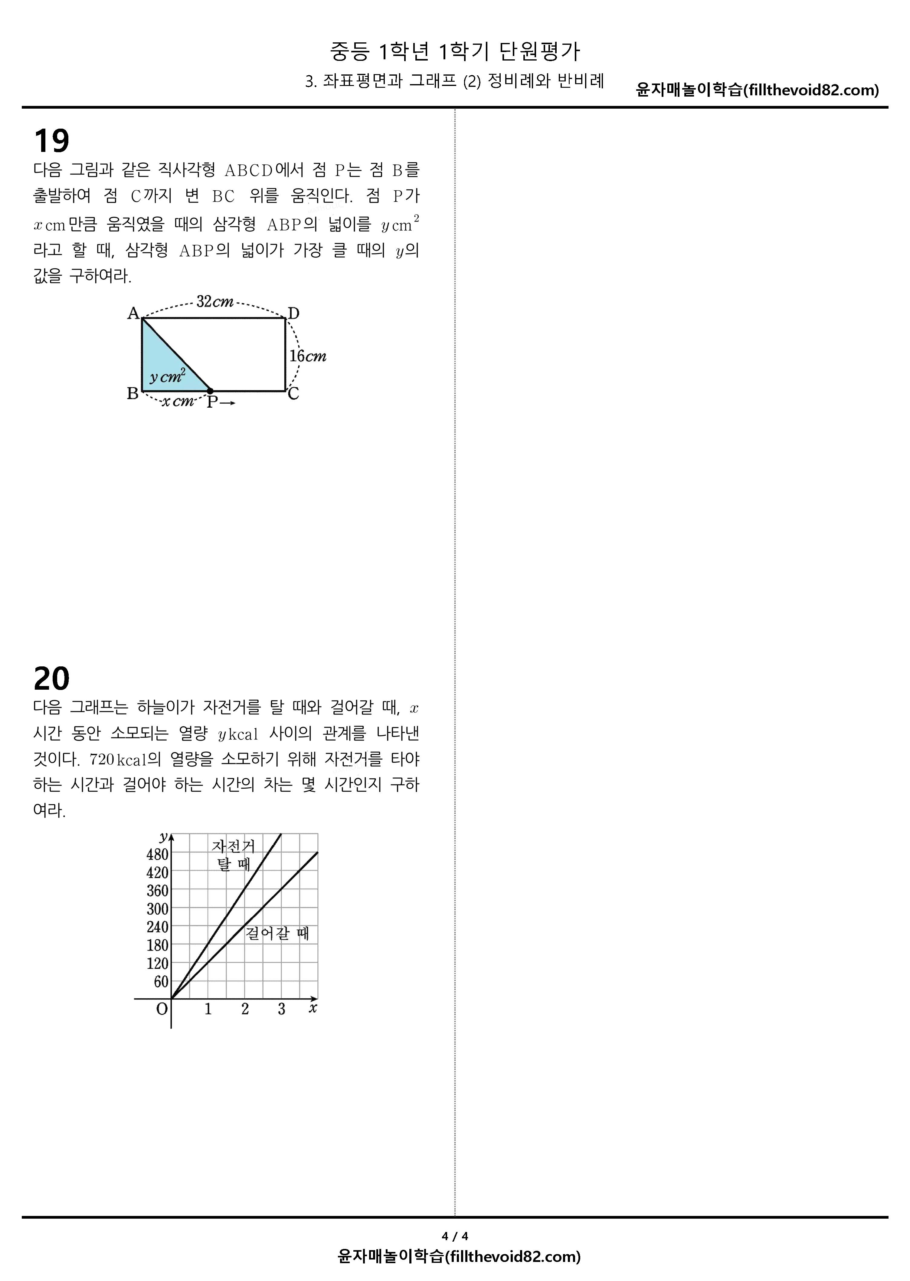 중1-1, 3(2) 정비례와 반비례 단원평가 20문제입니다.