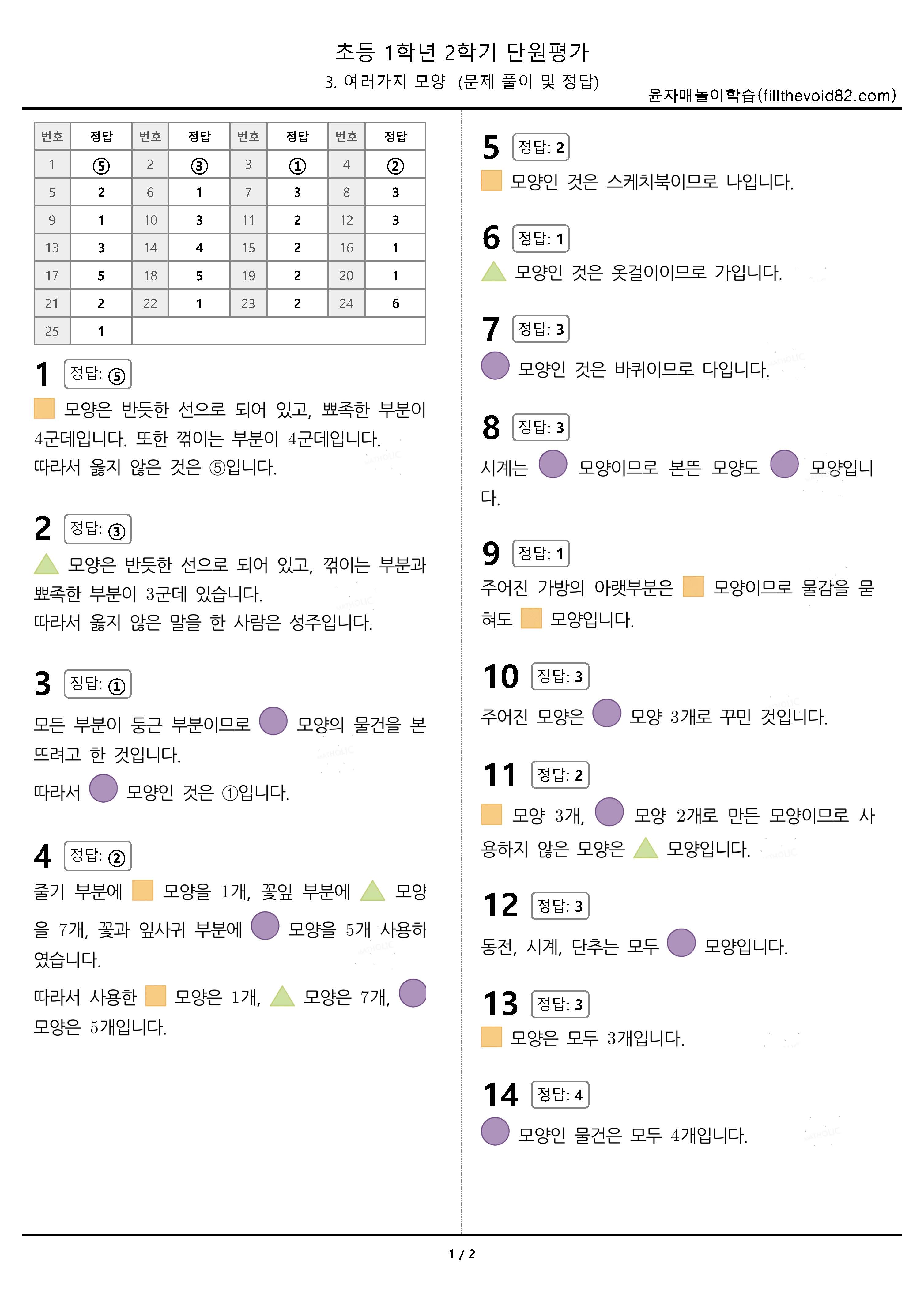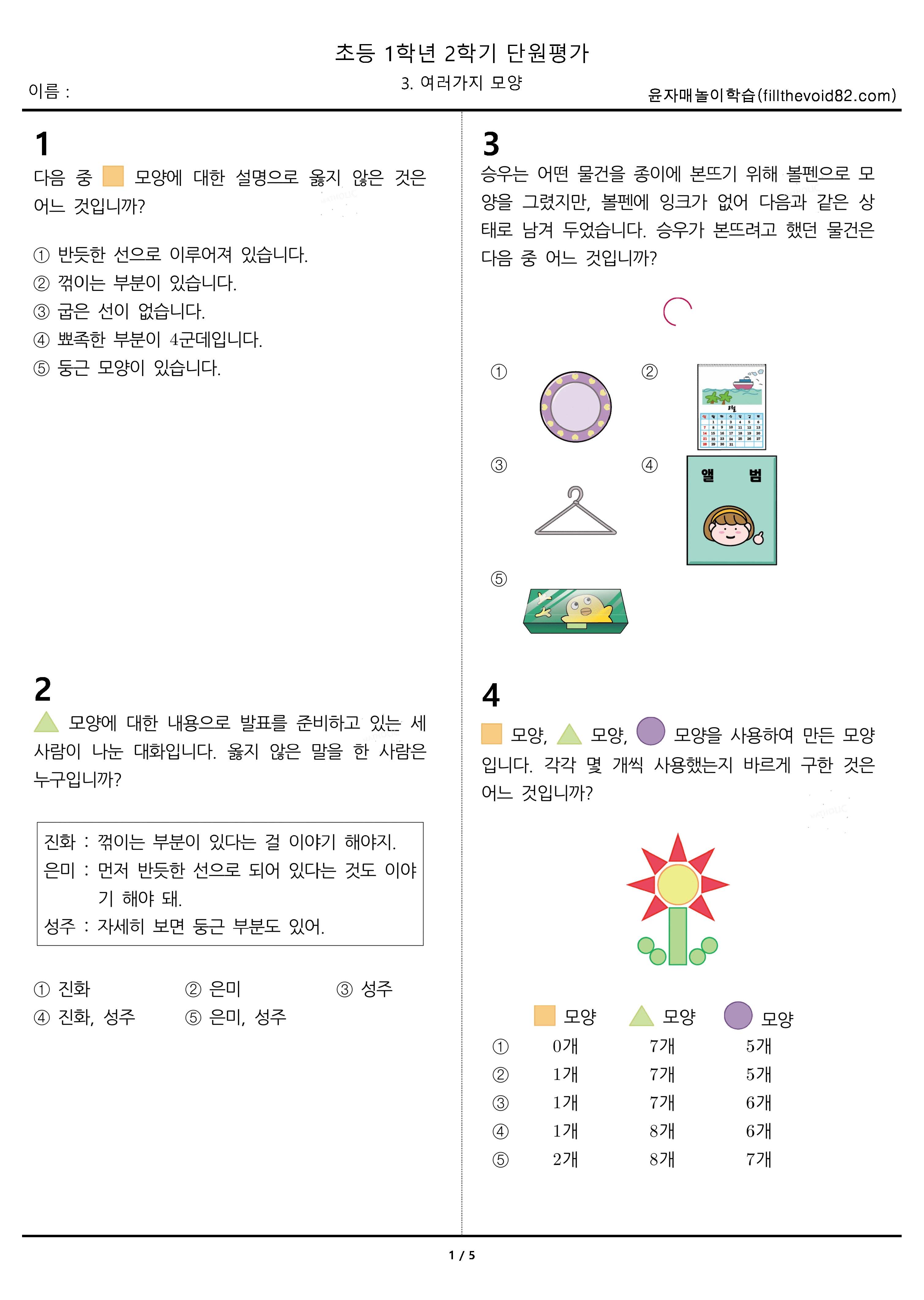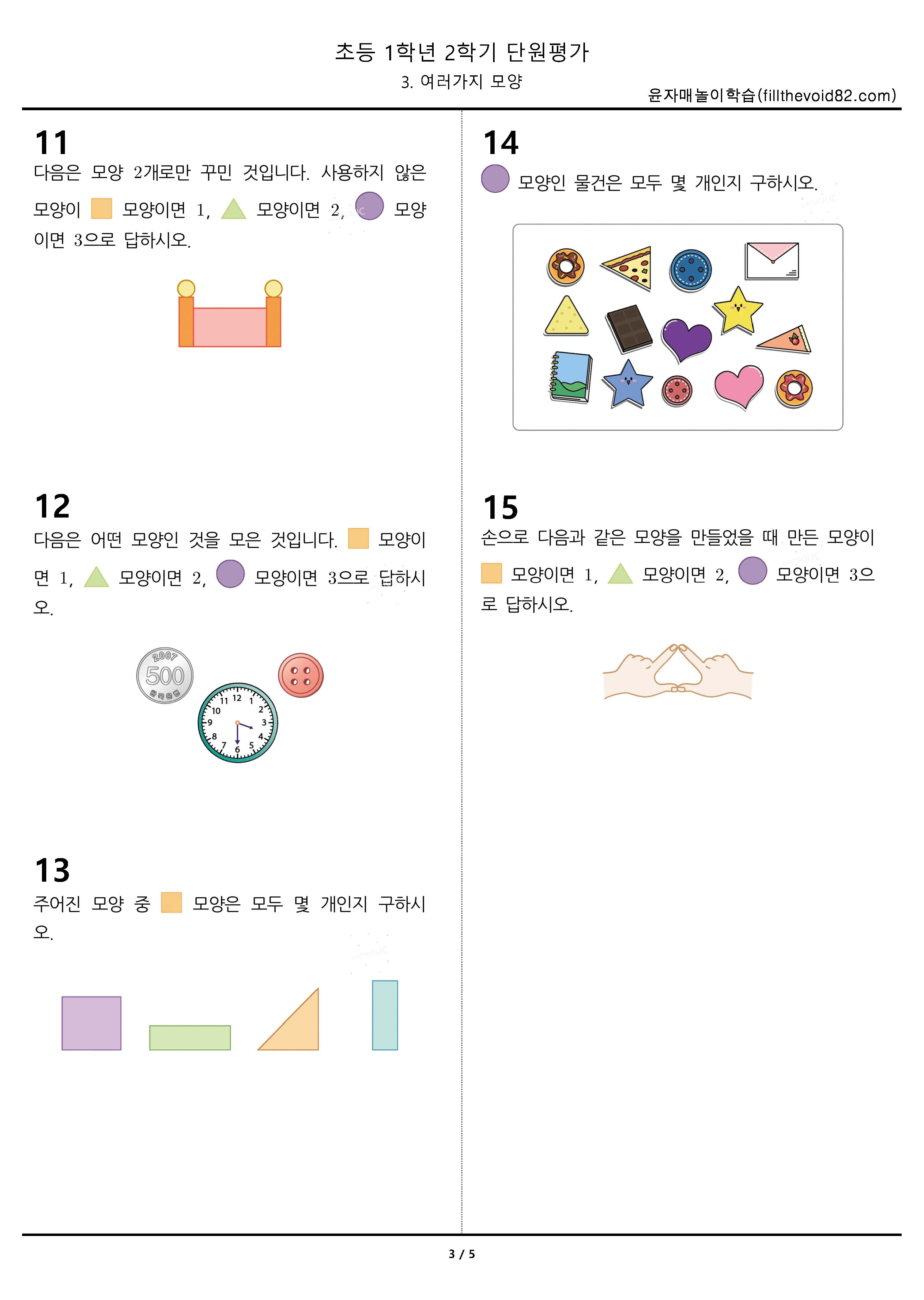 초등 1학년 2학기 3단원을 평가 할 수 있는 무료학습지입니다.