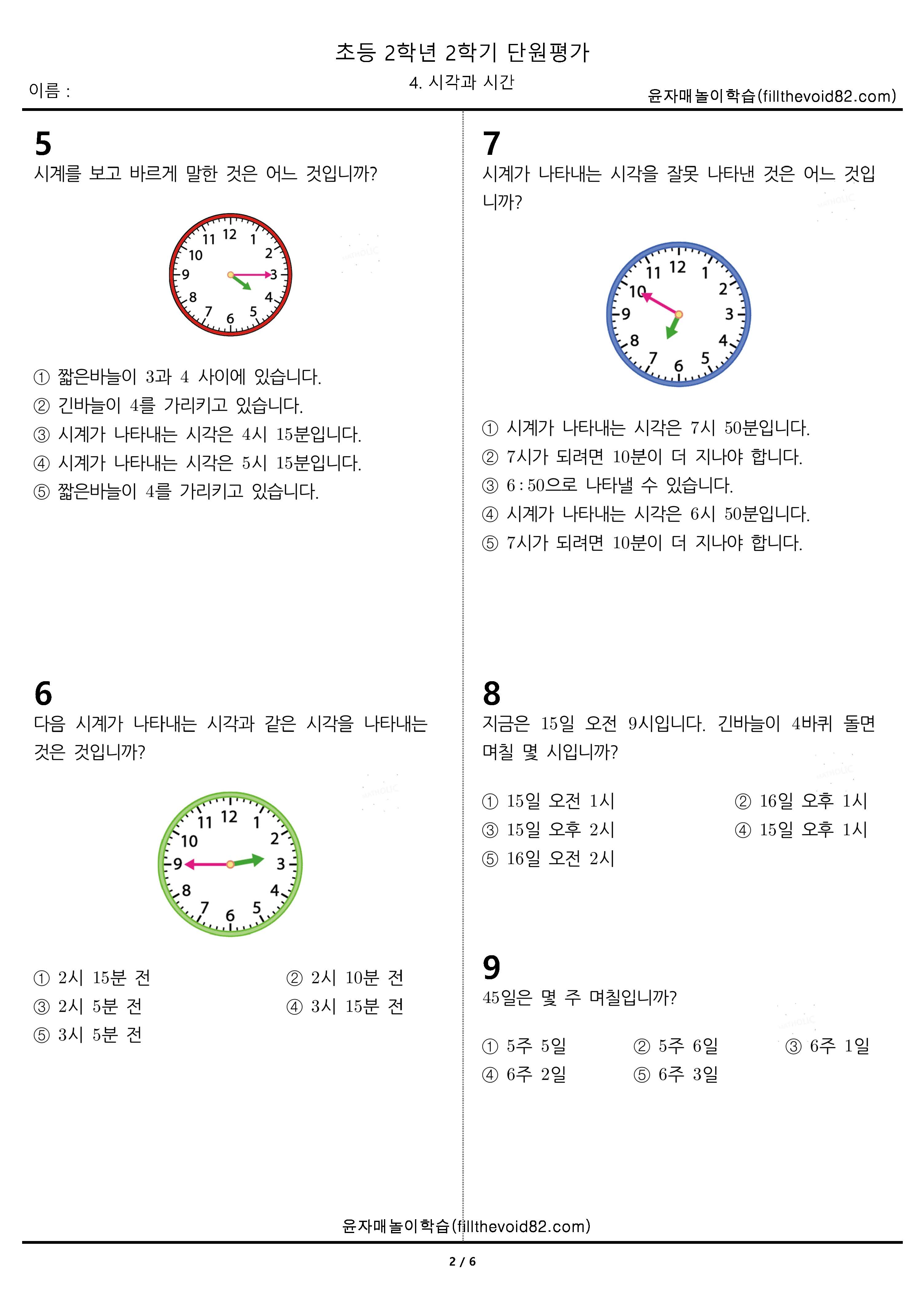초등수학) 무료학습지) 초등단원평가) 초등 2학년 2학기 - 4. 시각과 시간
