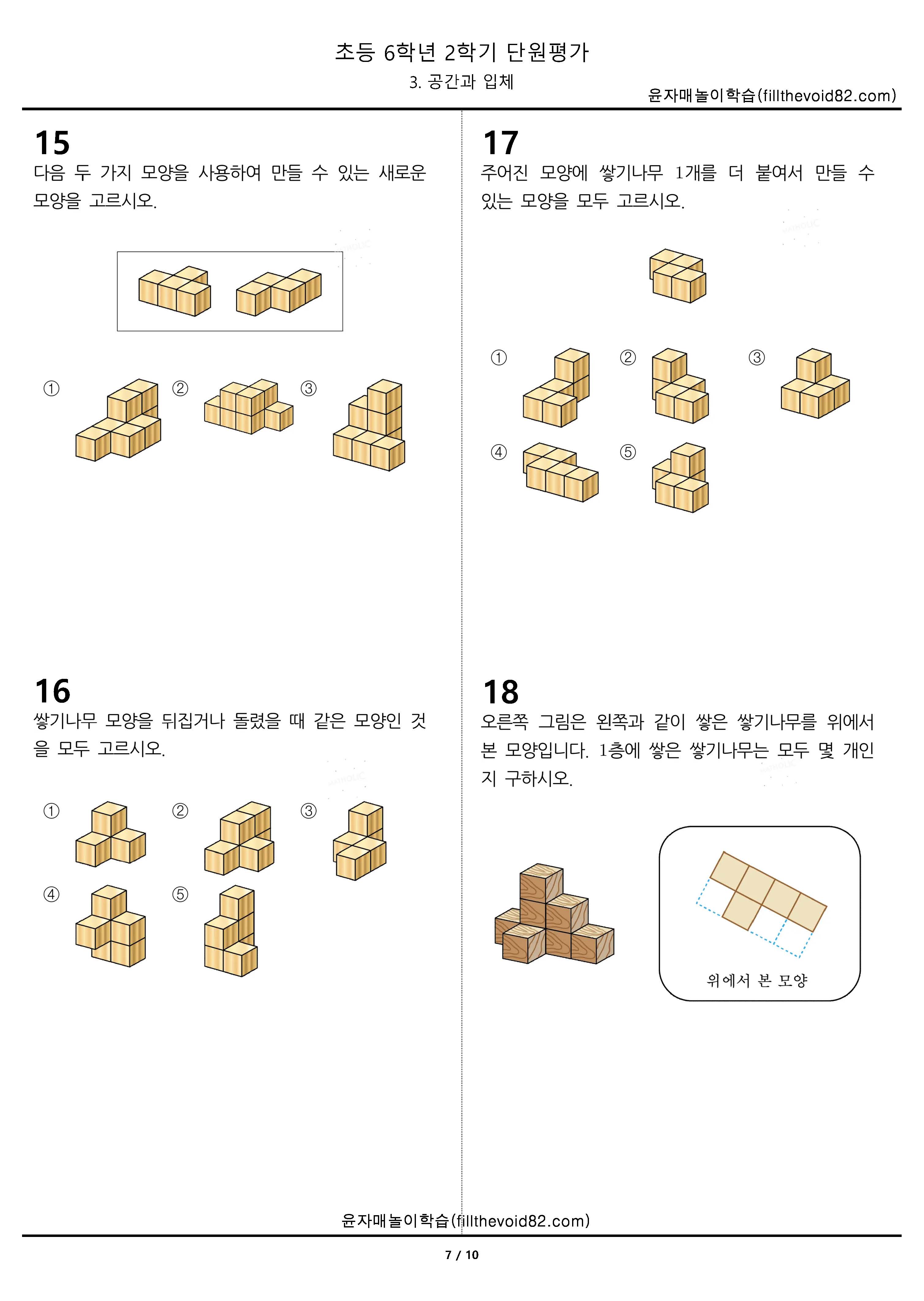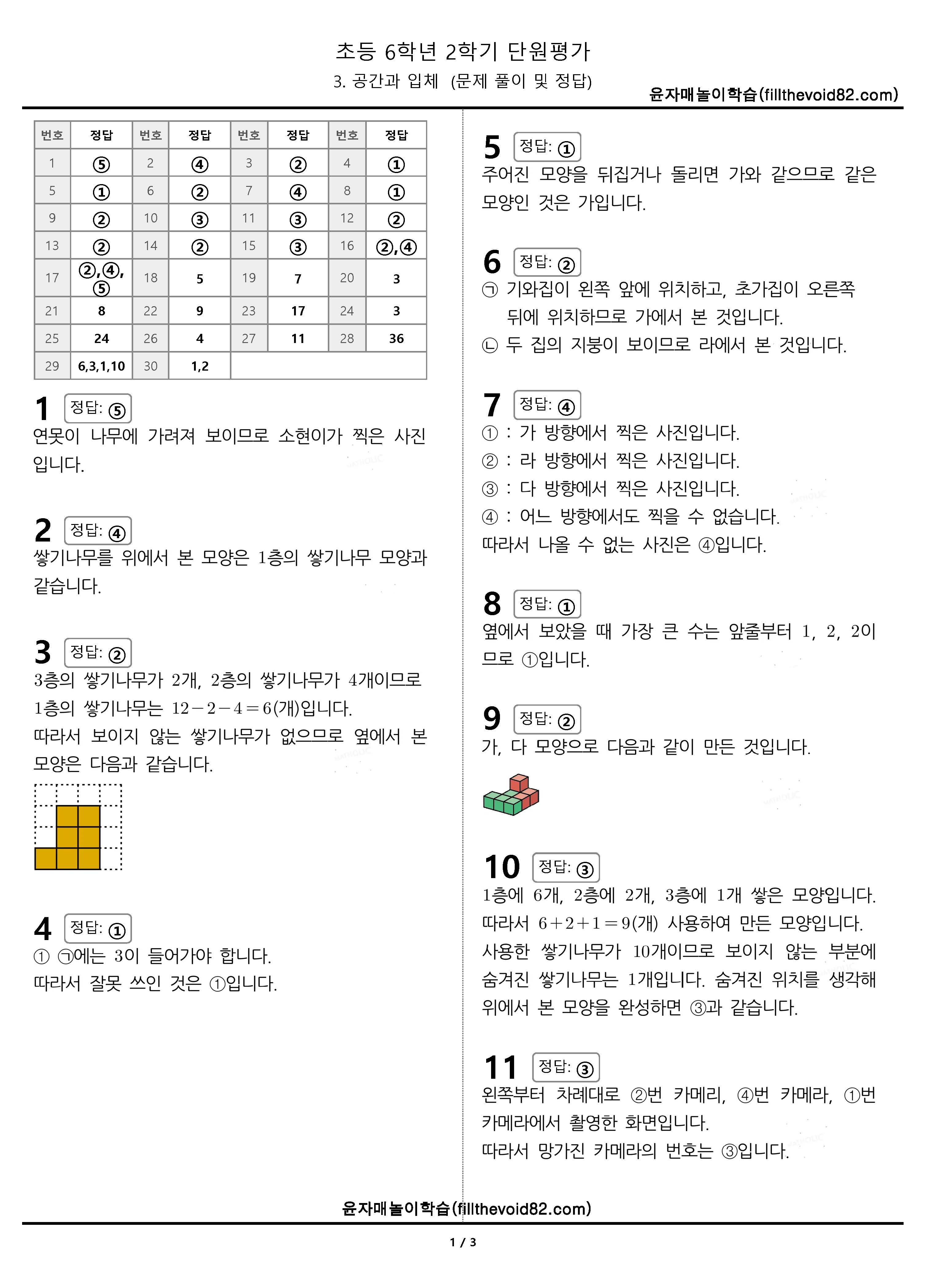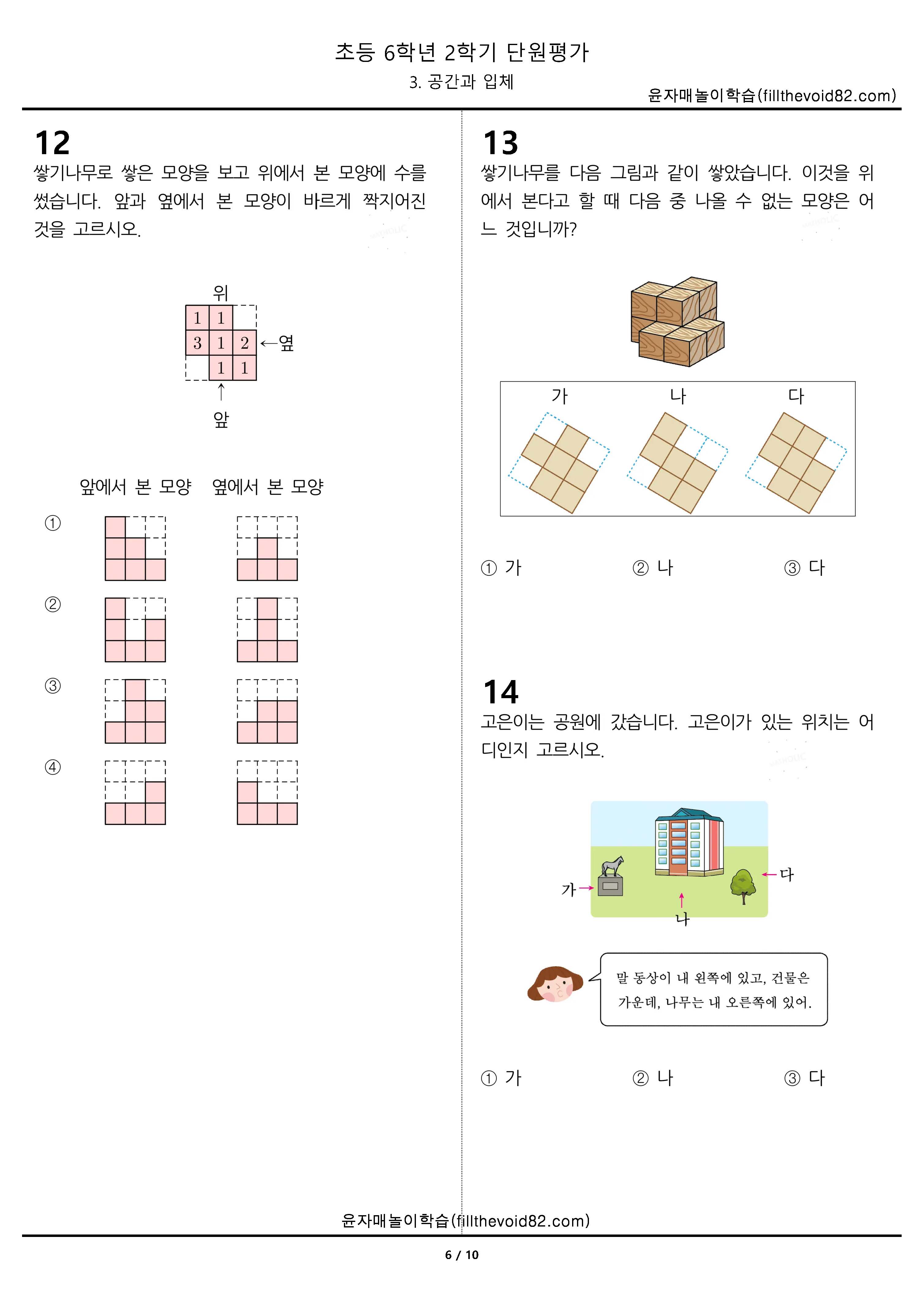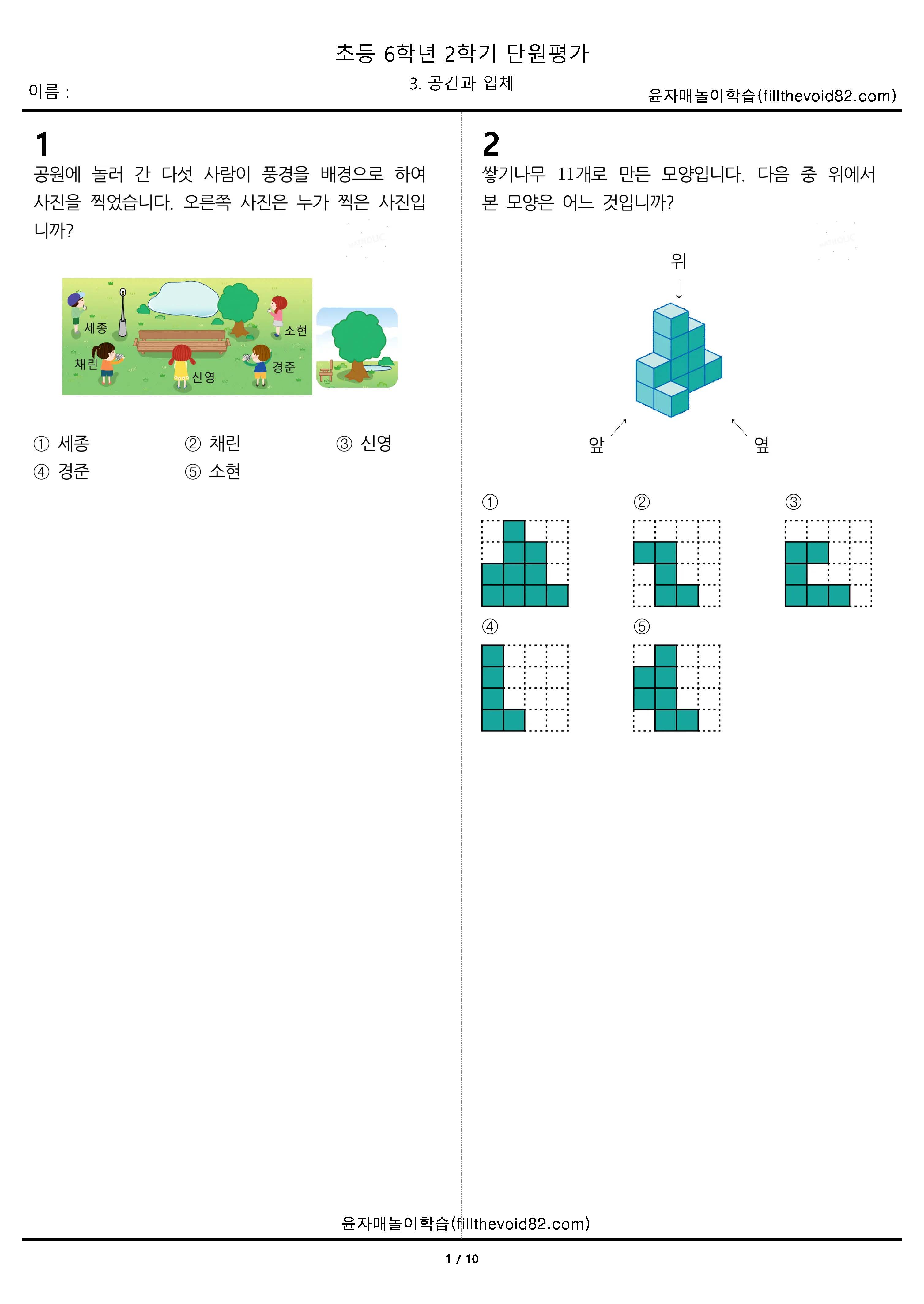 초등무료학습지) 초등단원평가) 초등 6학년 2학기 - 3. 공간과 입체