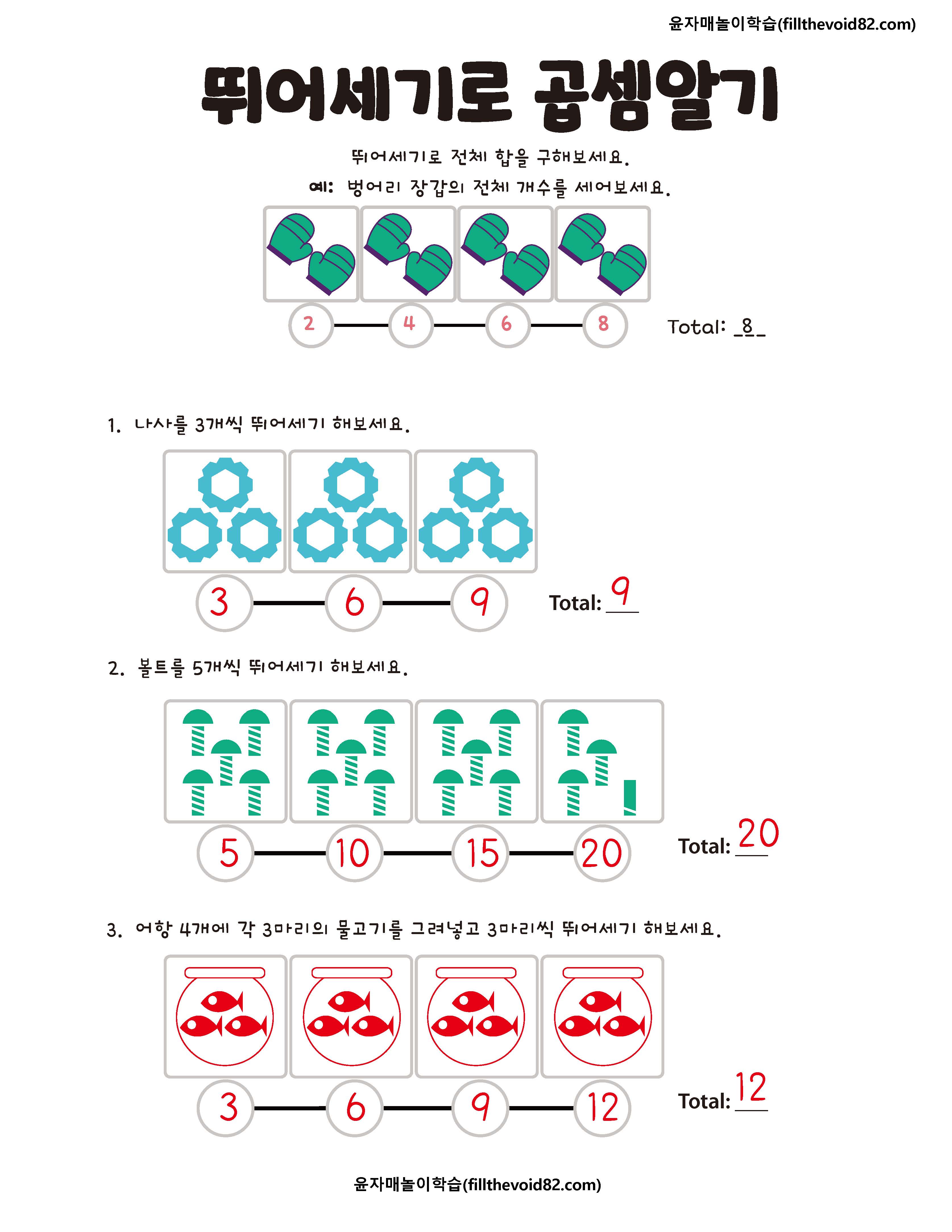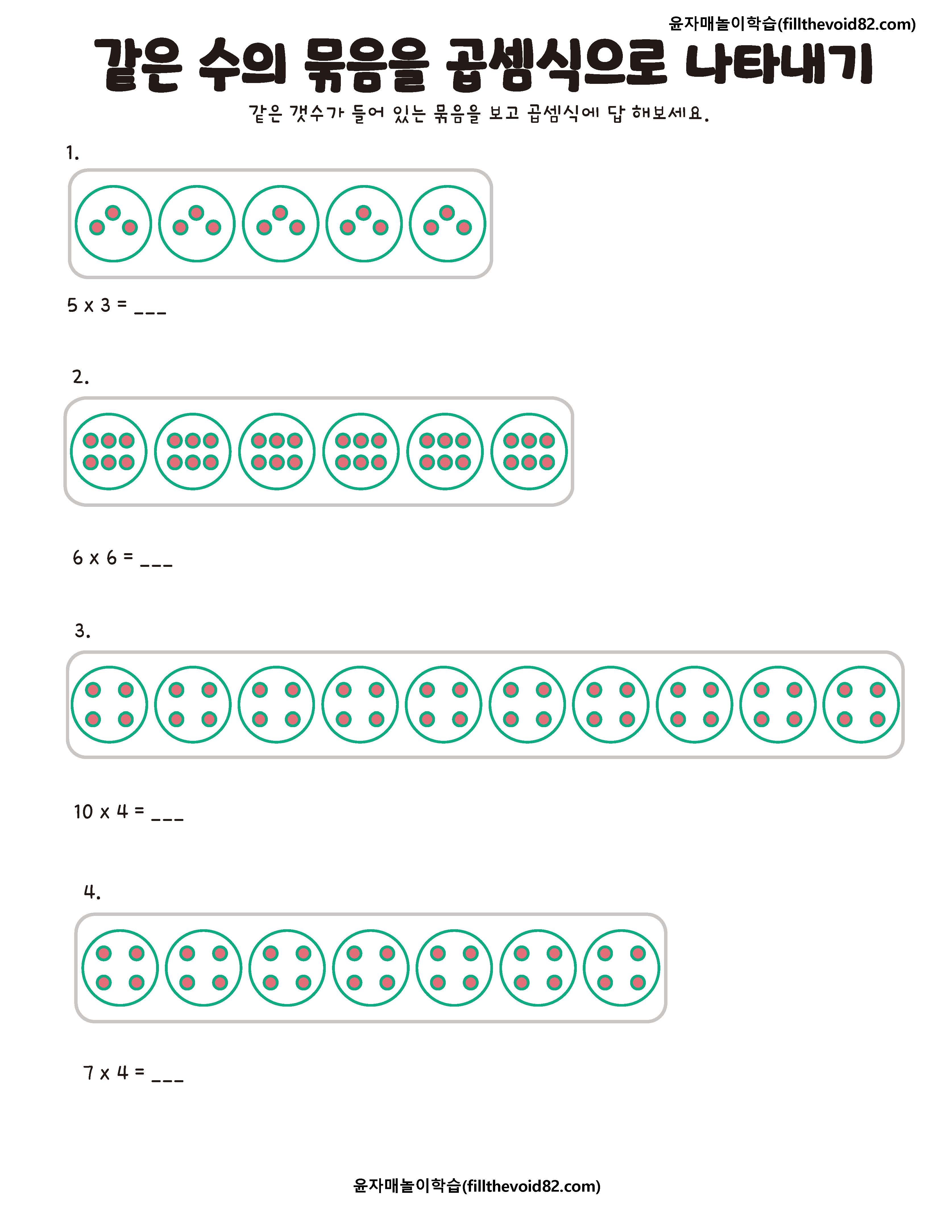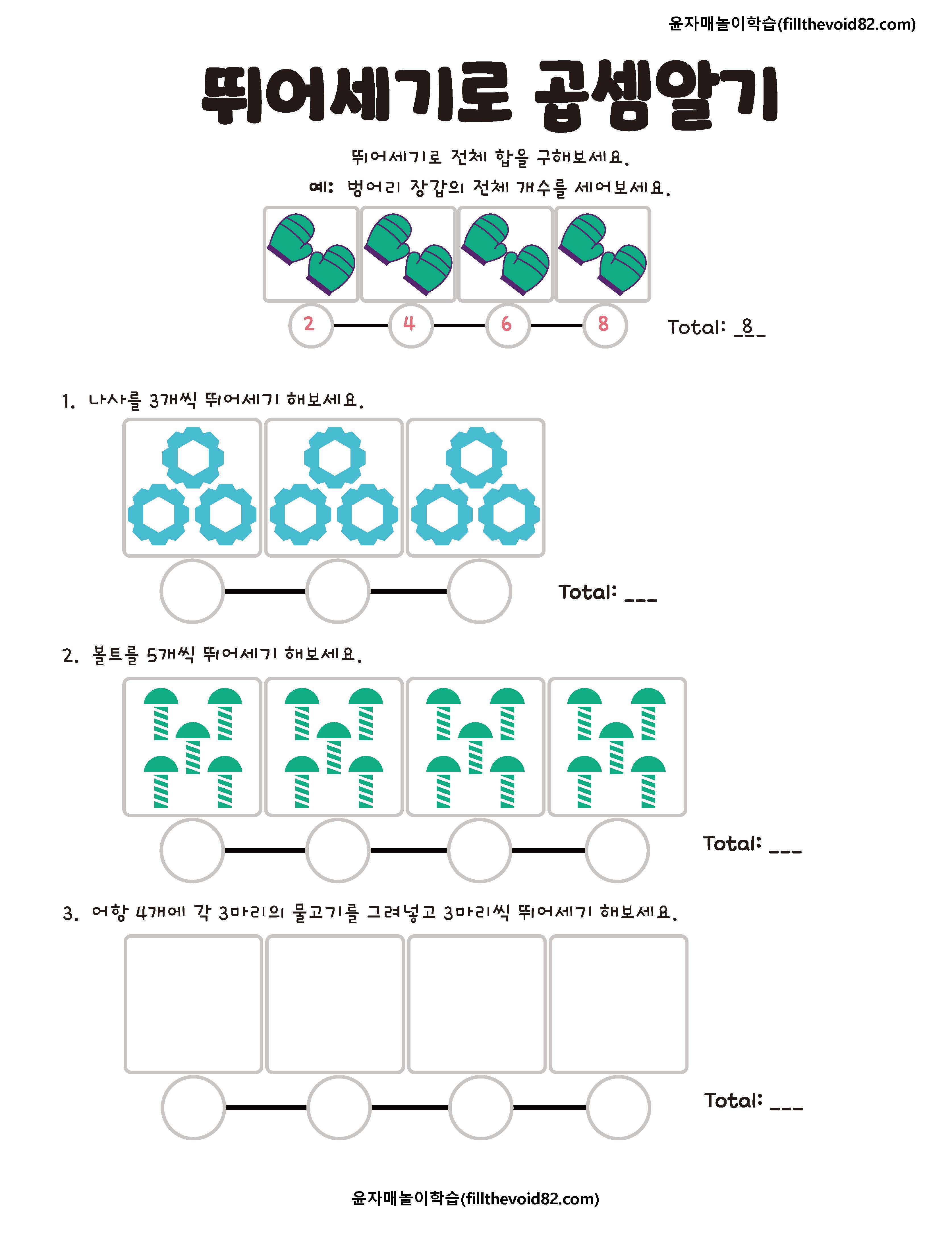 같은 수로 뛰어세며 곱셈의 기초를 학습할 수 있는 활동지입니다.