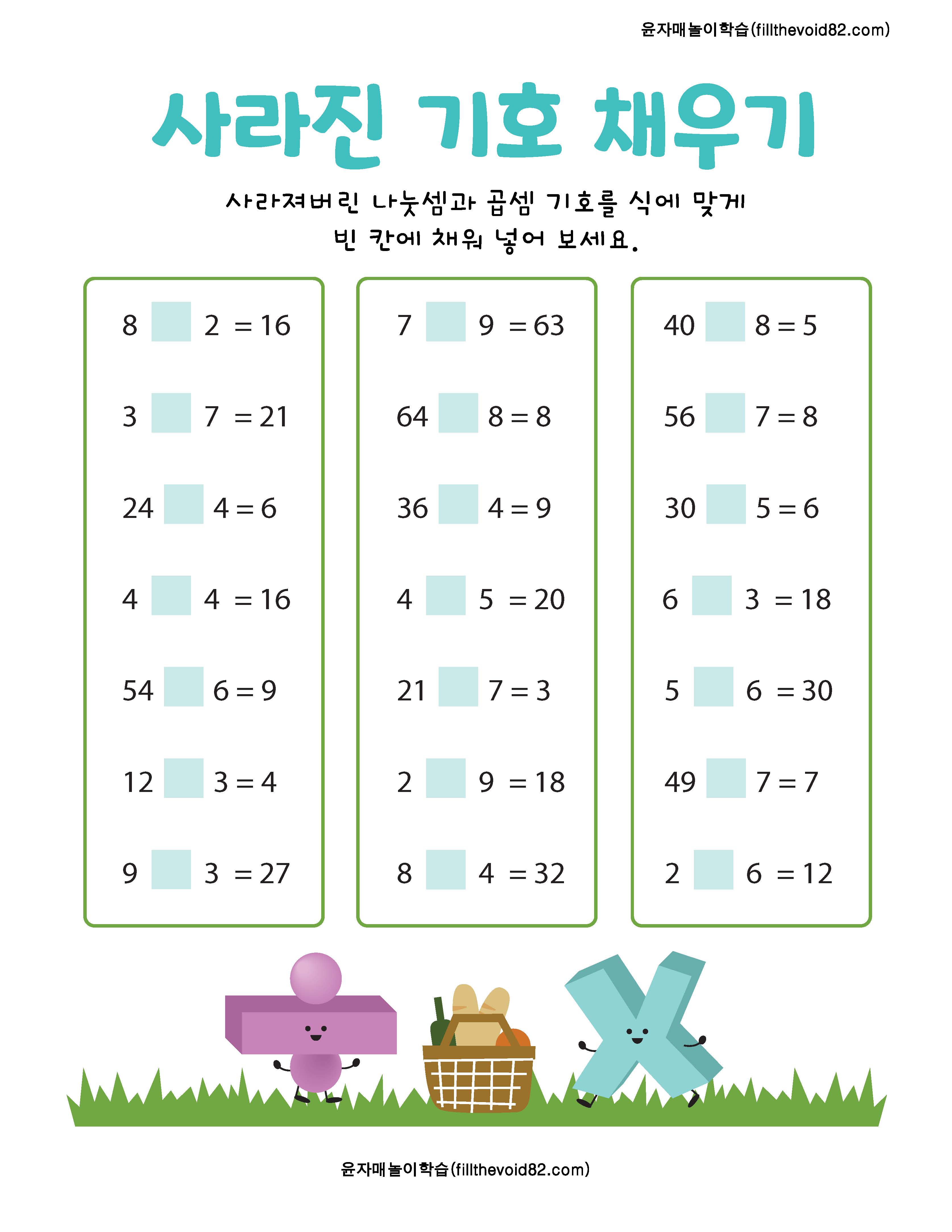 나눗셈과 곱셈이 혼합되어 있는 활동지와 문제를 읽고 나눗셈 식을 세워볼 수 있는 활동지입니다.