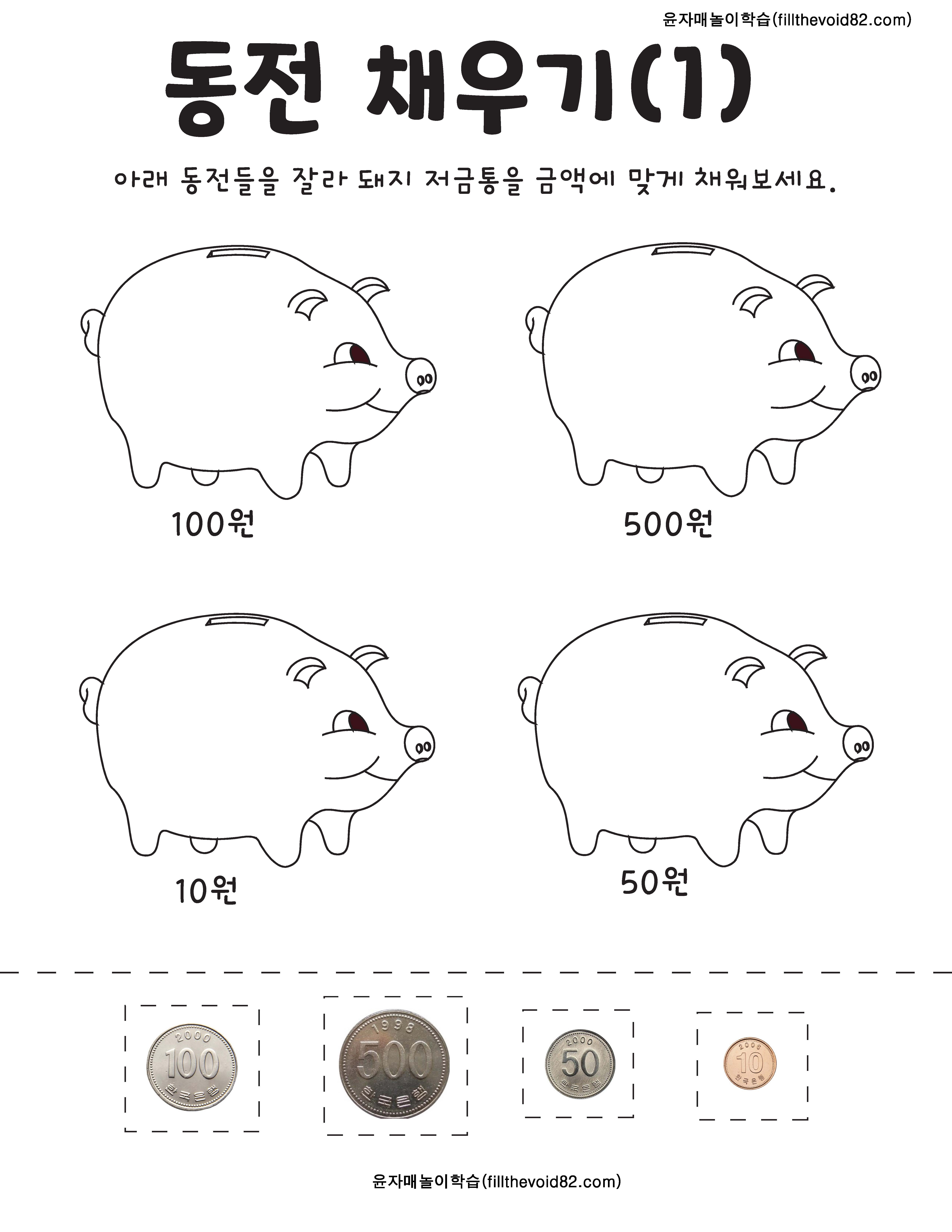 오백원, 백원, 오십원, 십원 돈세기를 연습할 수 있는 활동지 입니다.
