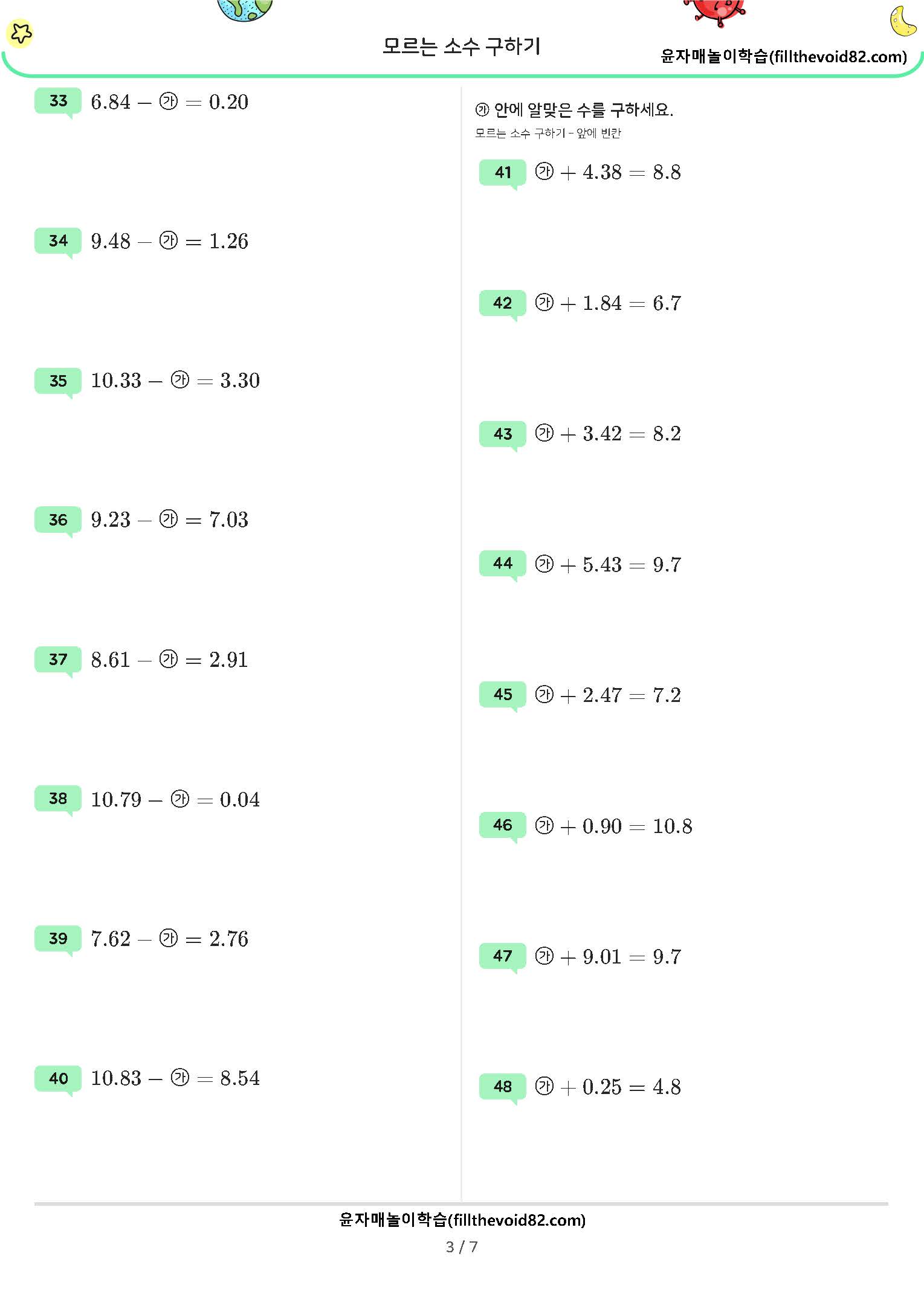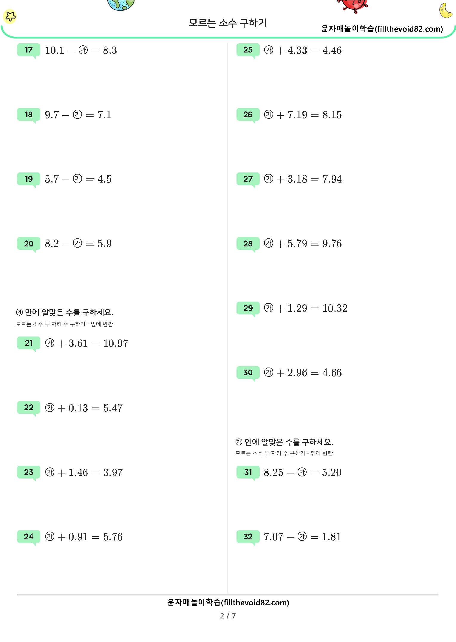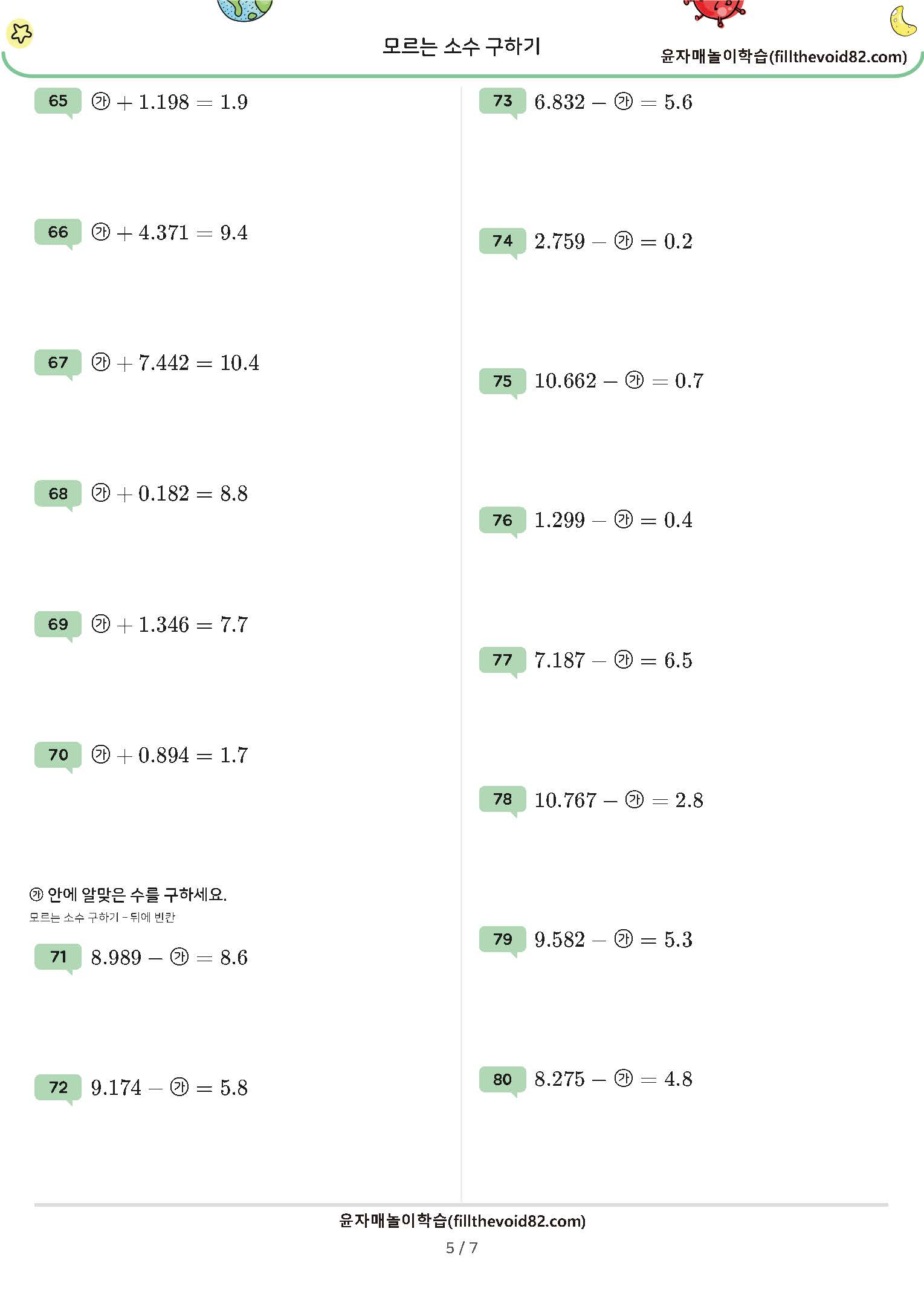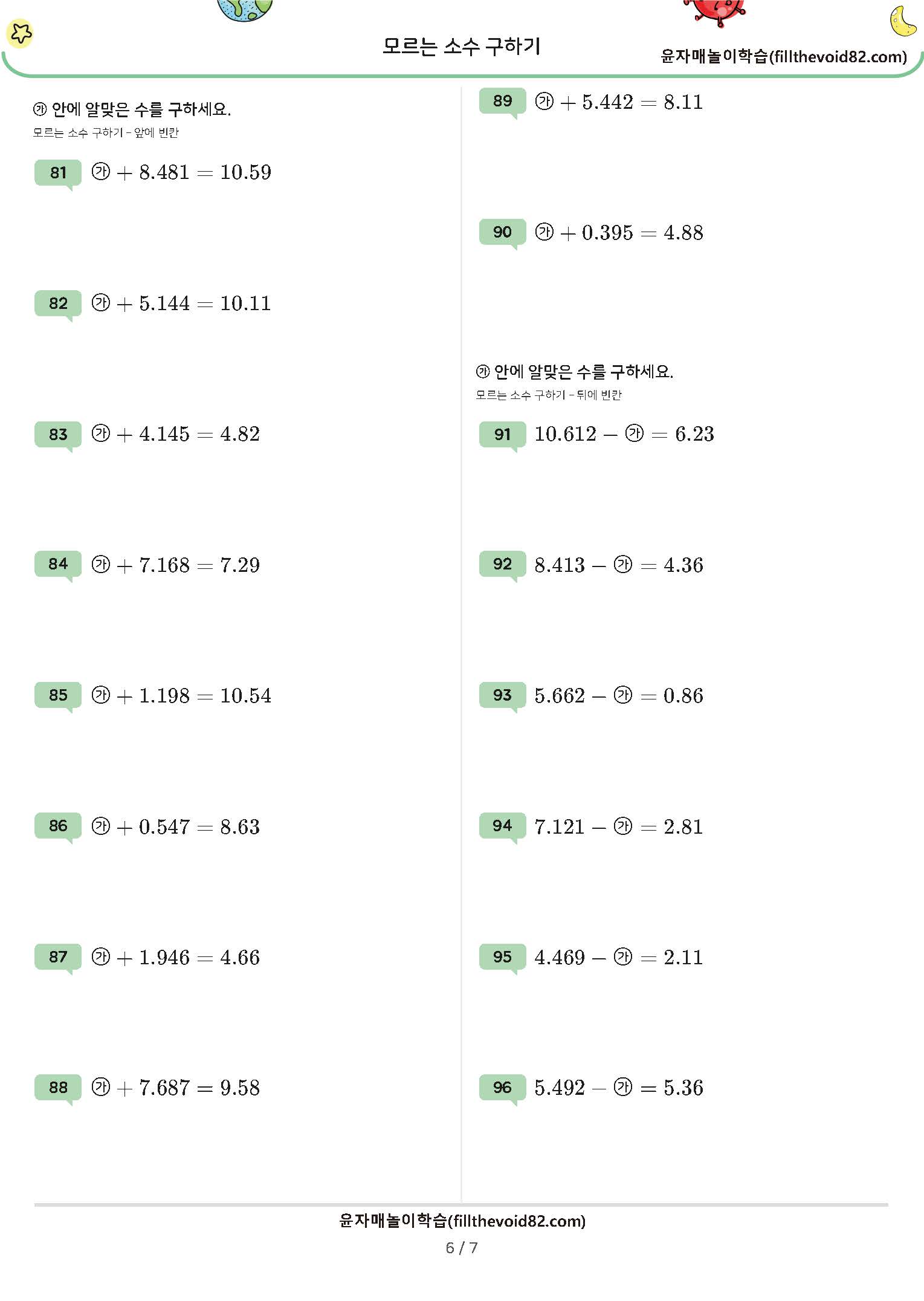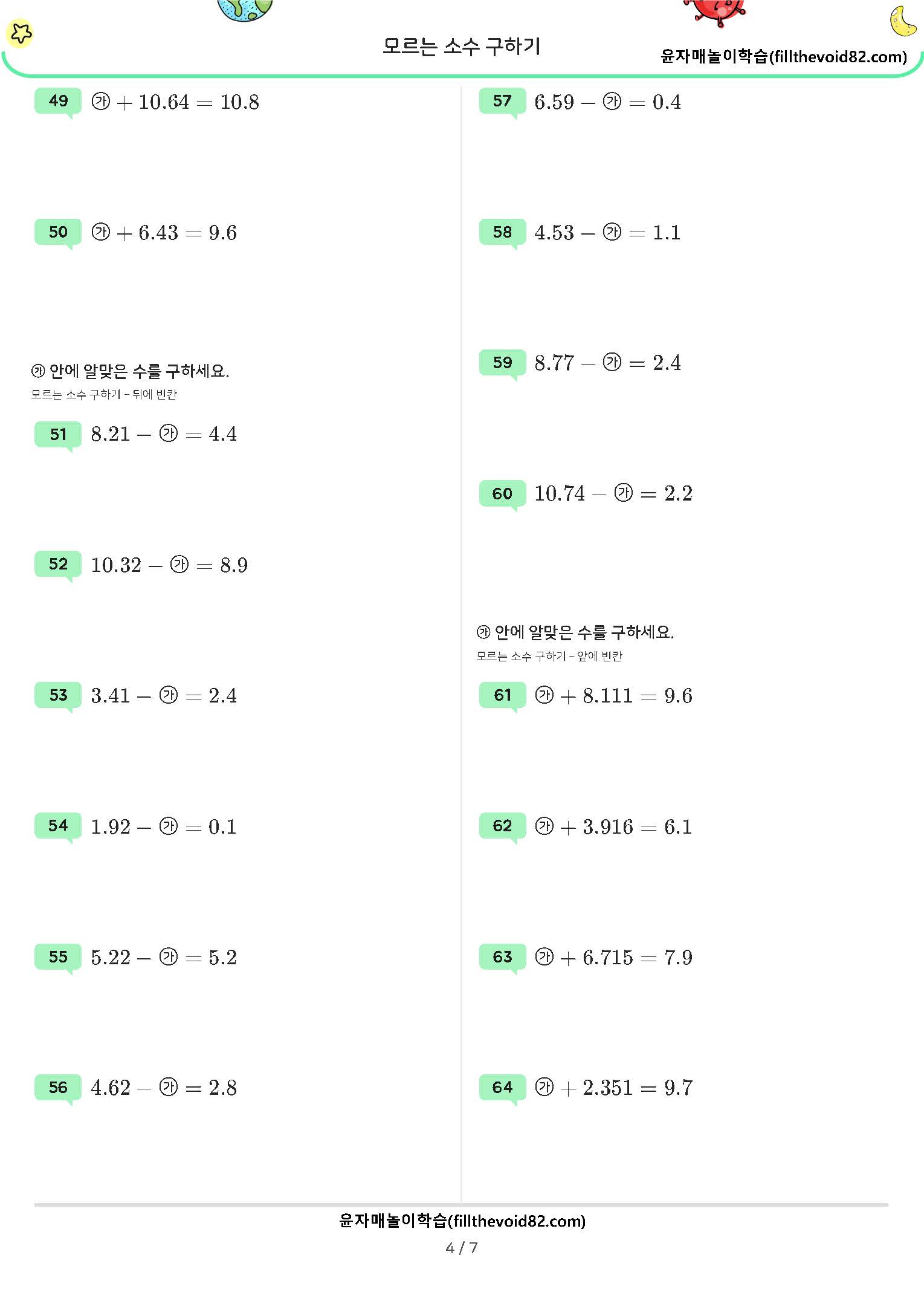소수의 덧셈과 뺄셈의 모르는 수 구하기를 학습 할 수 있는 활동지입니다.