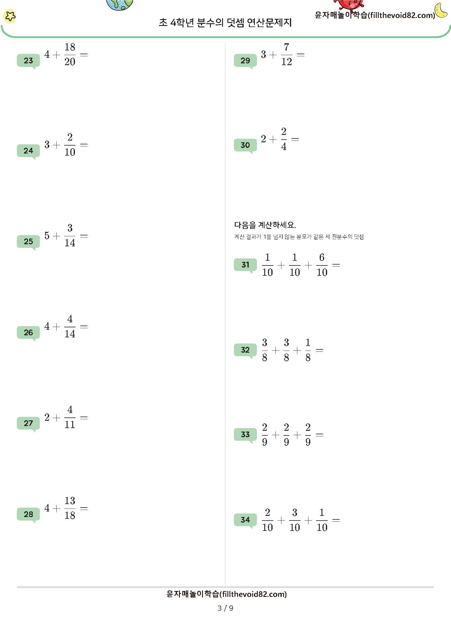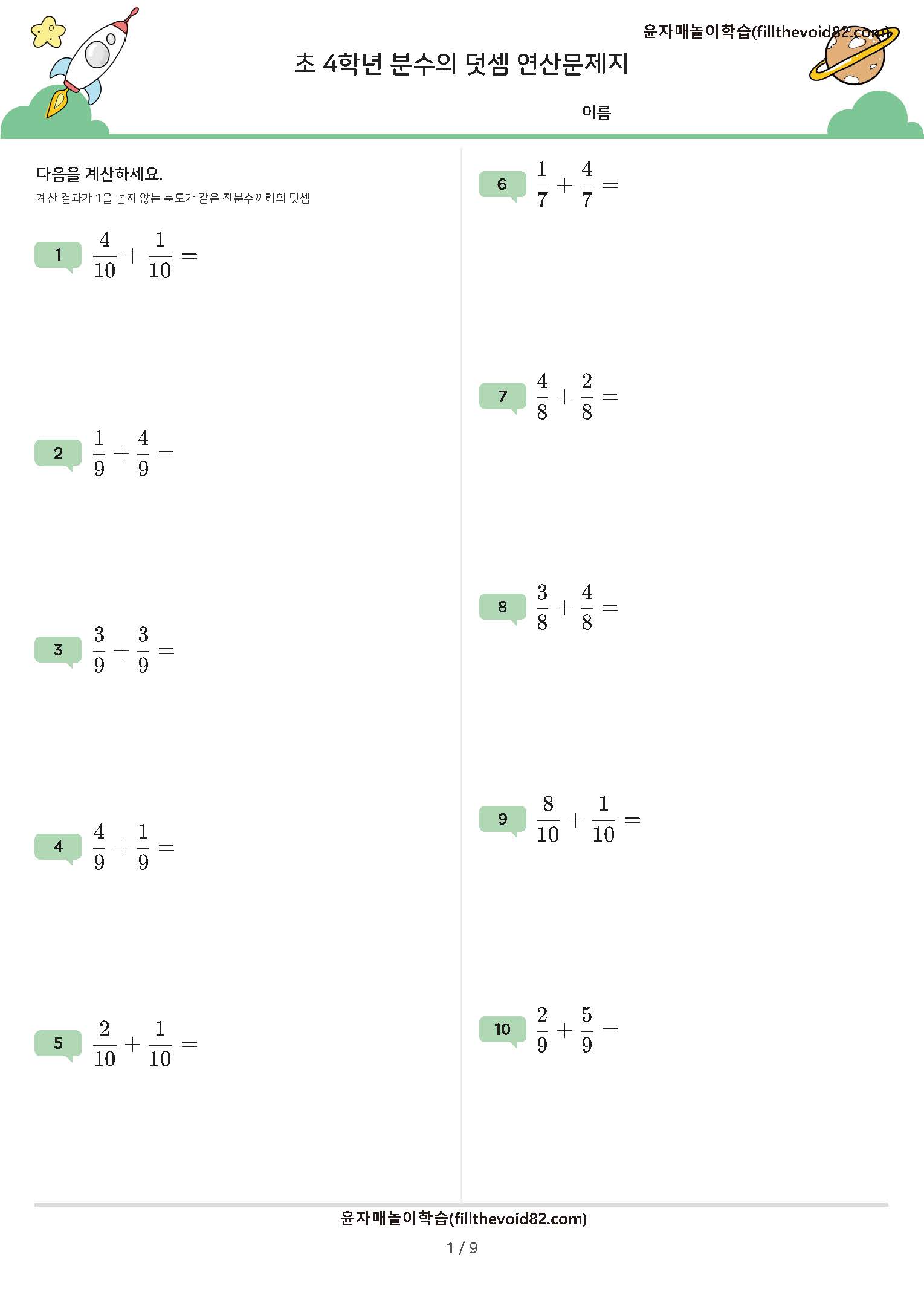 진분수와 대분수의 덧셈을 학습할 수 있는 연산문제지입니다.