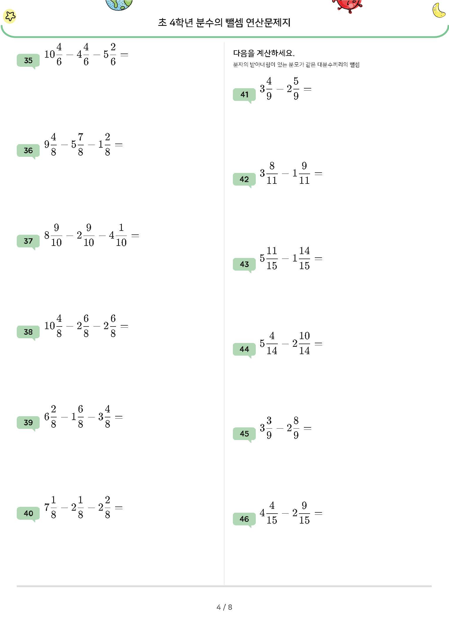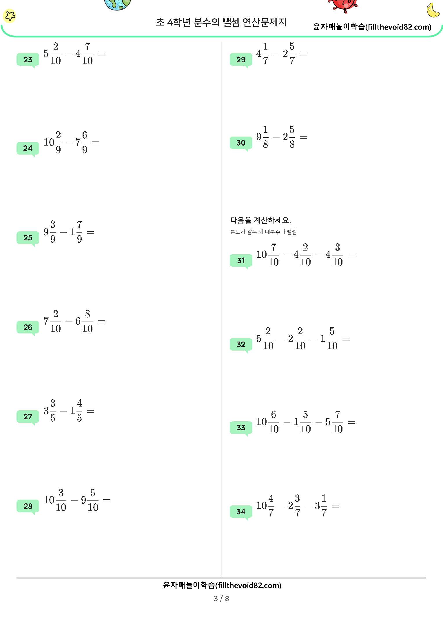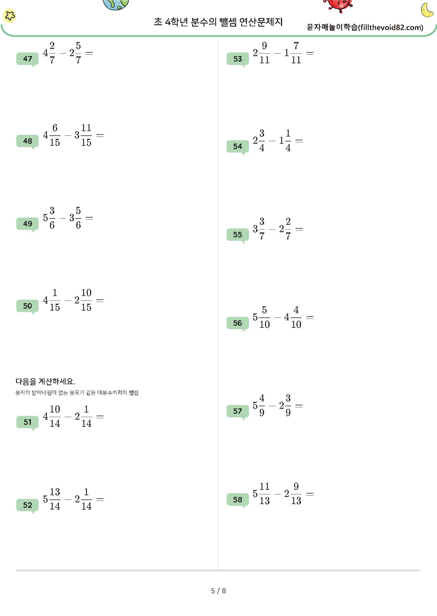 진분수, 대분수의 뺄셈을 학습 할 수 있는 연산문제지입니다.
