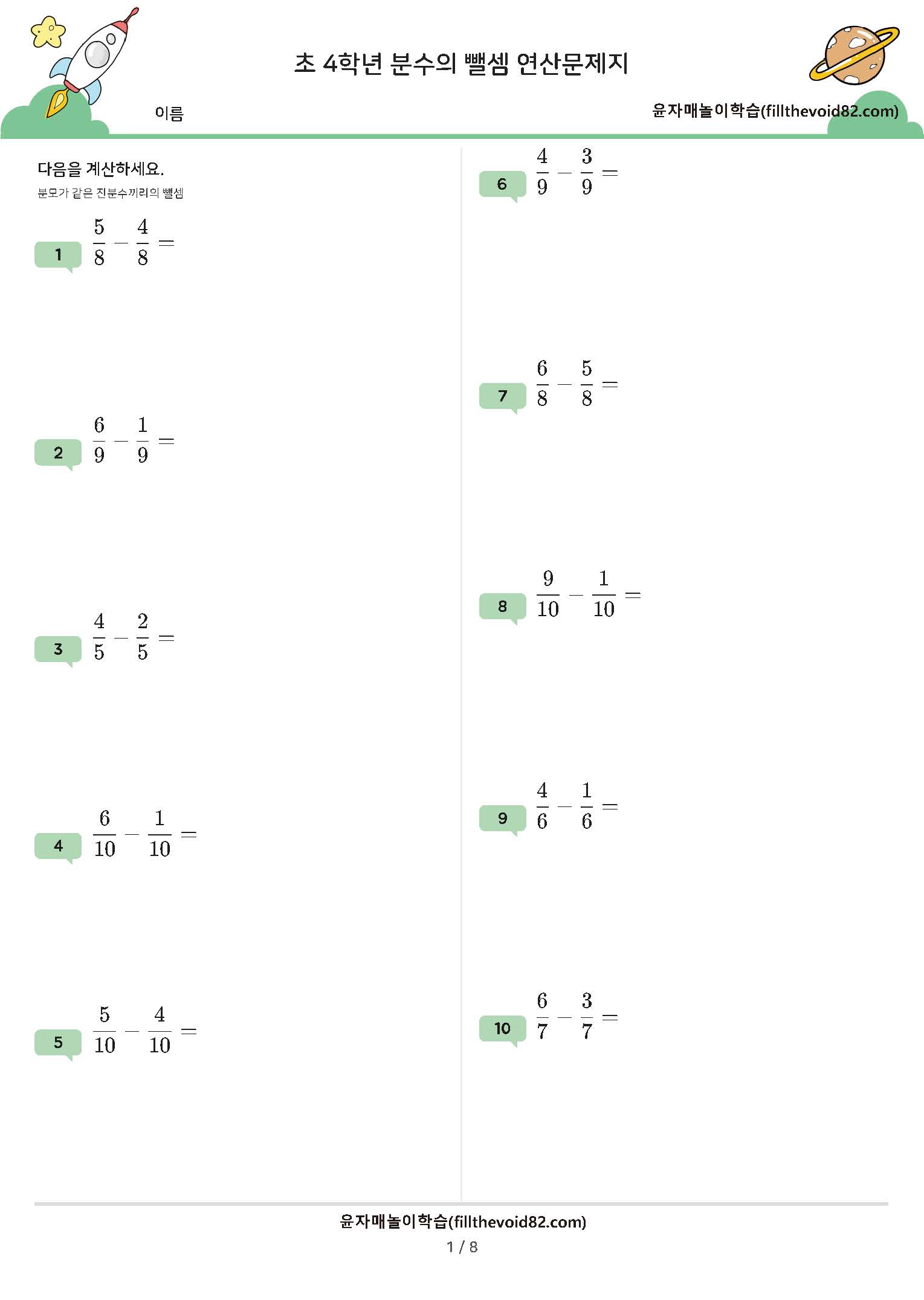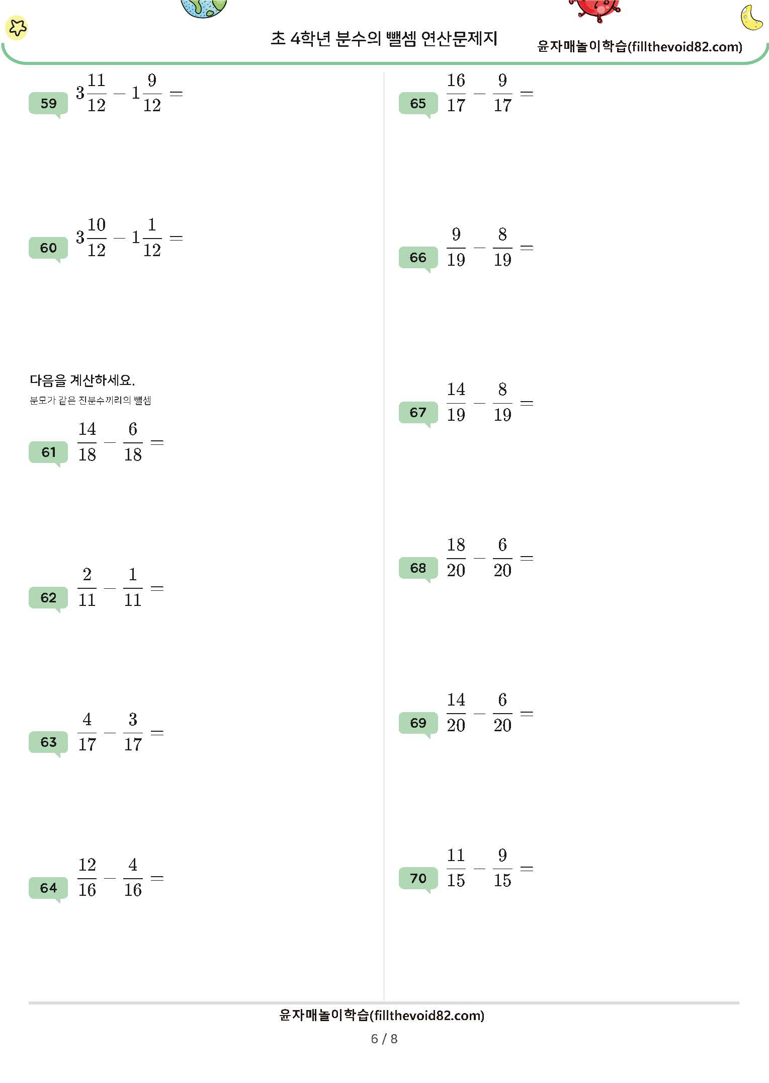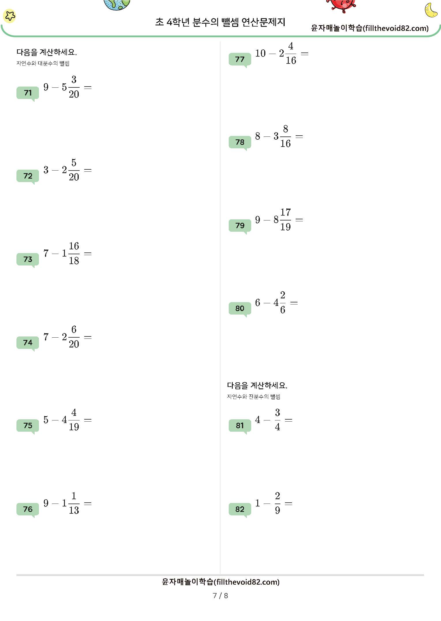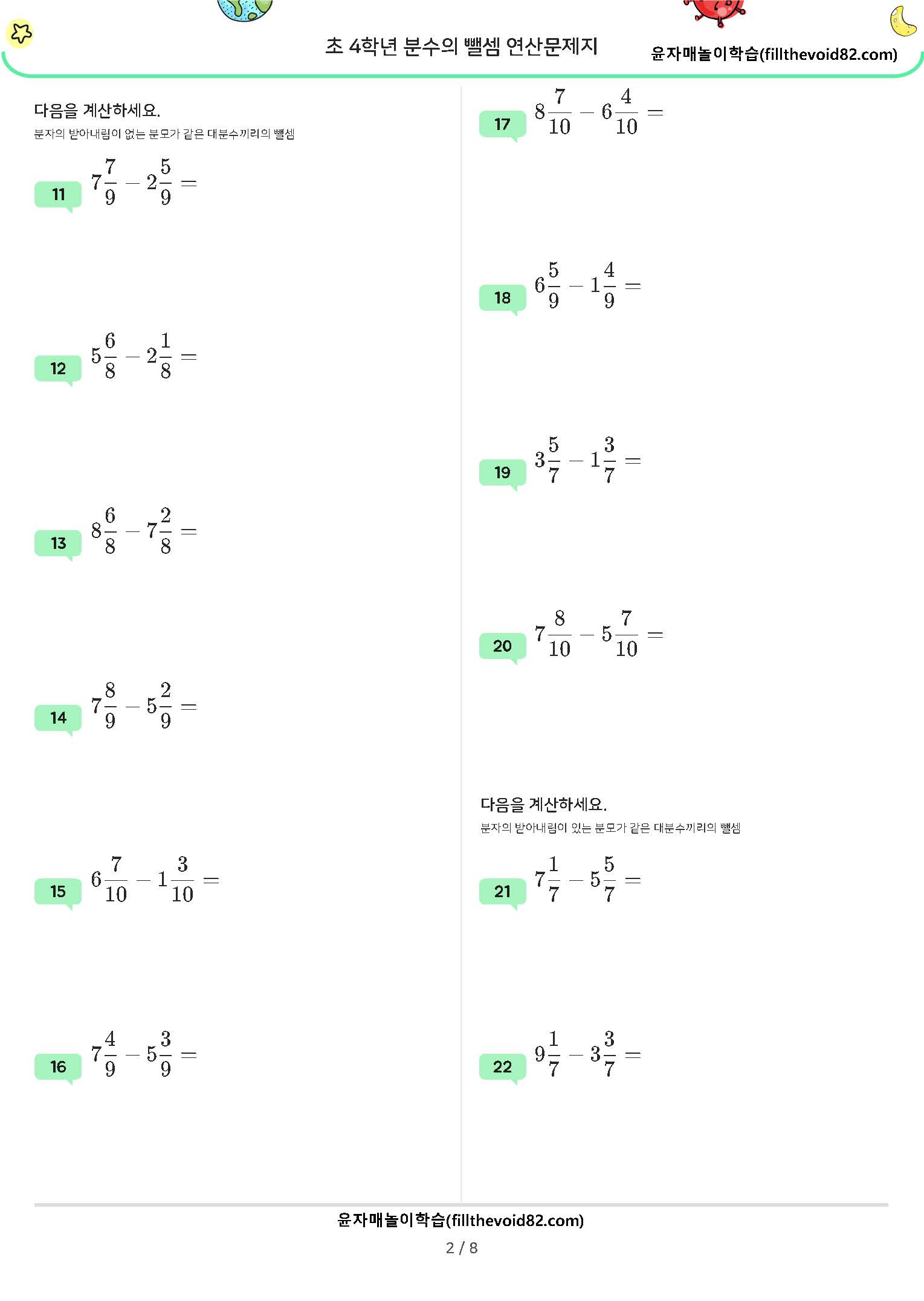 진분수, 대분수의 뺄셈을 학습 할 수 있는 연산문제지입니다.