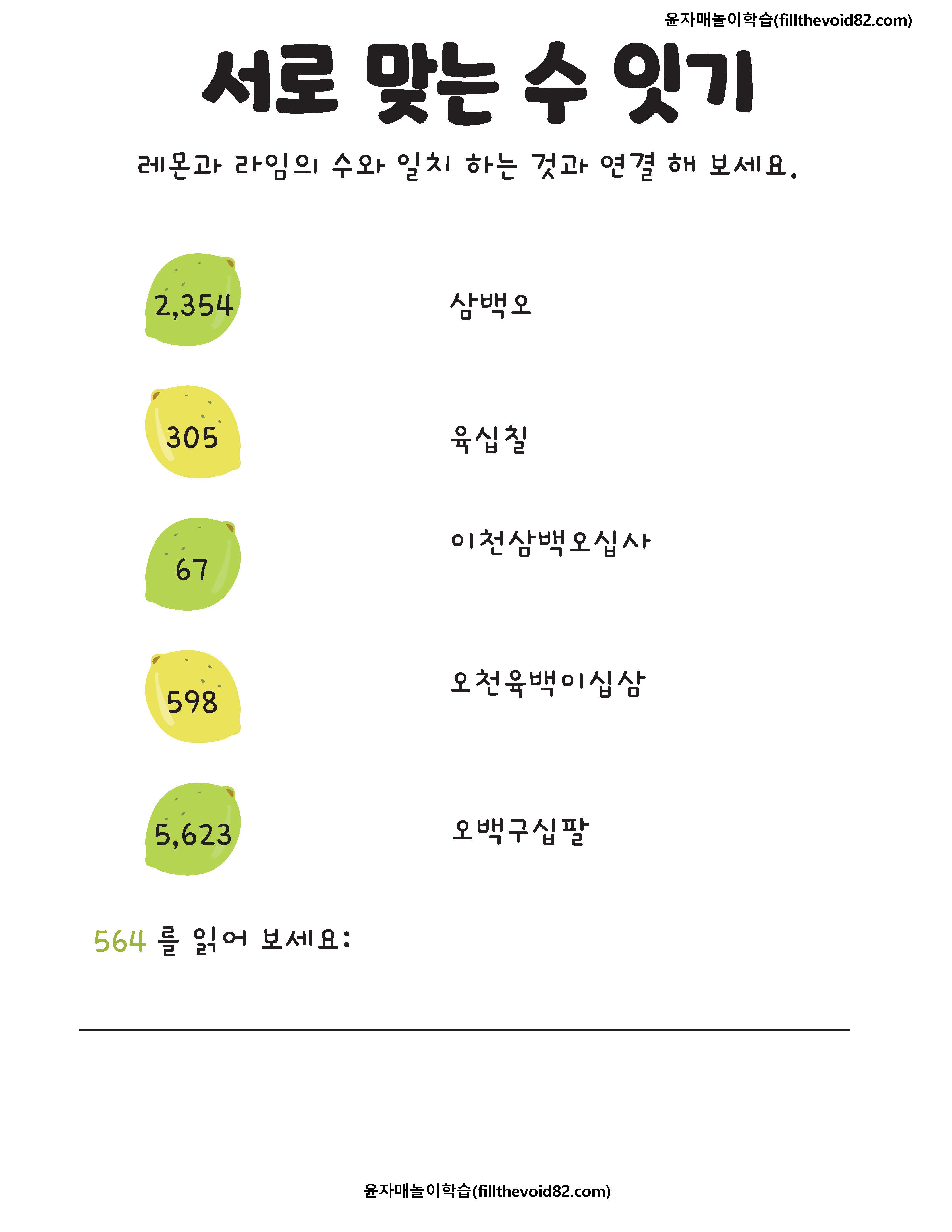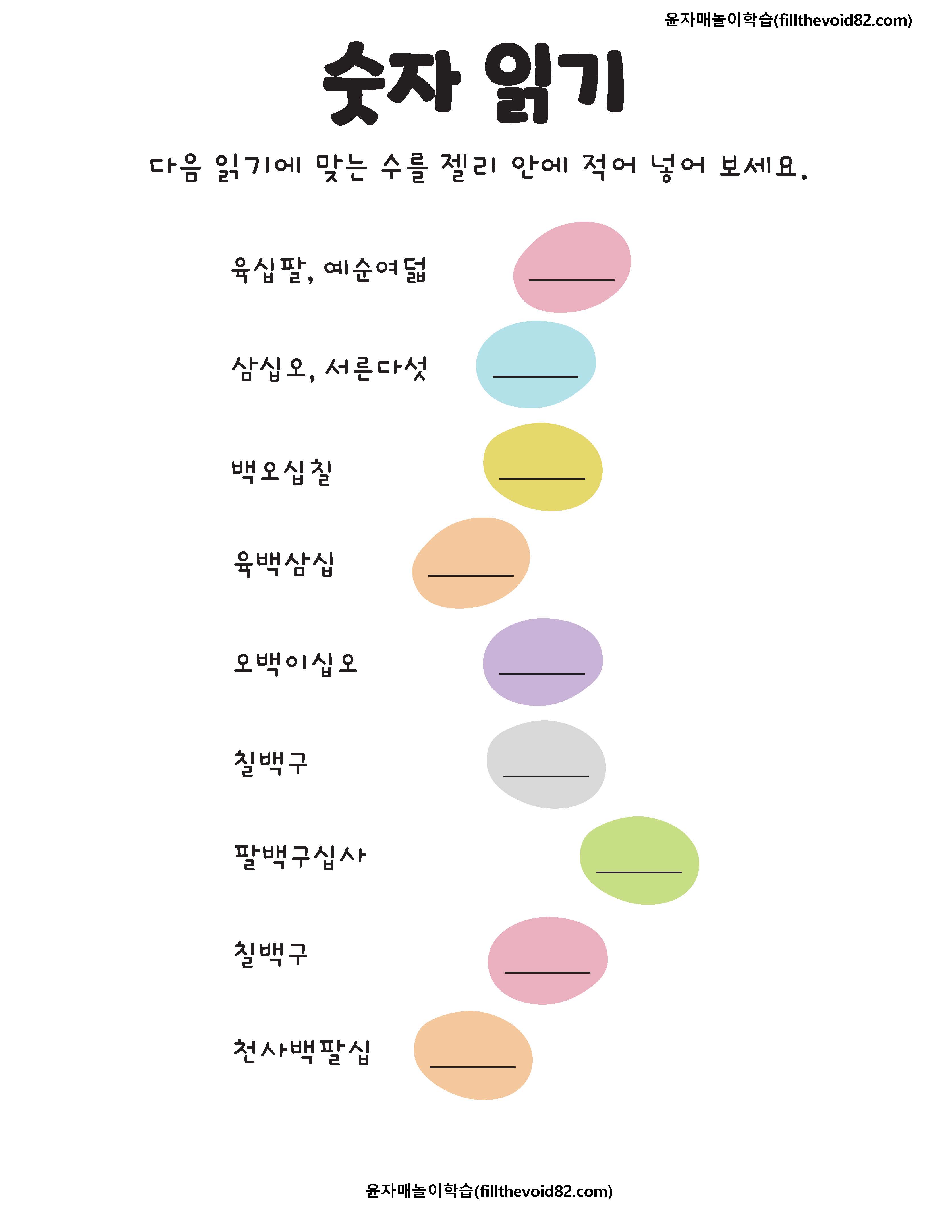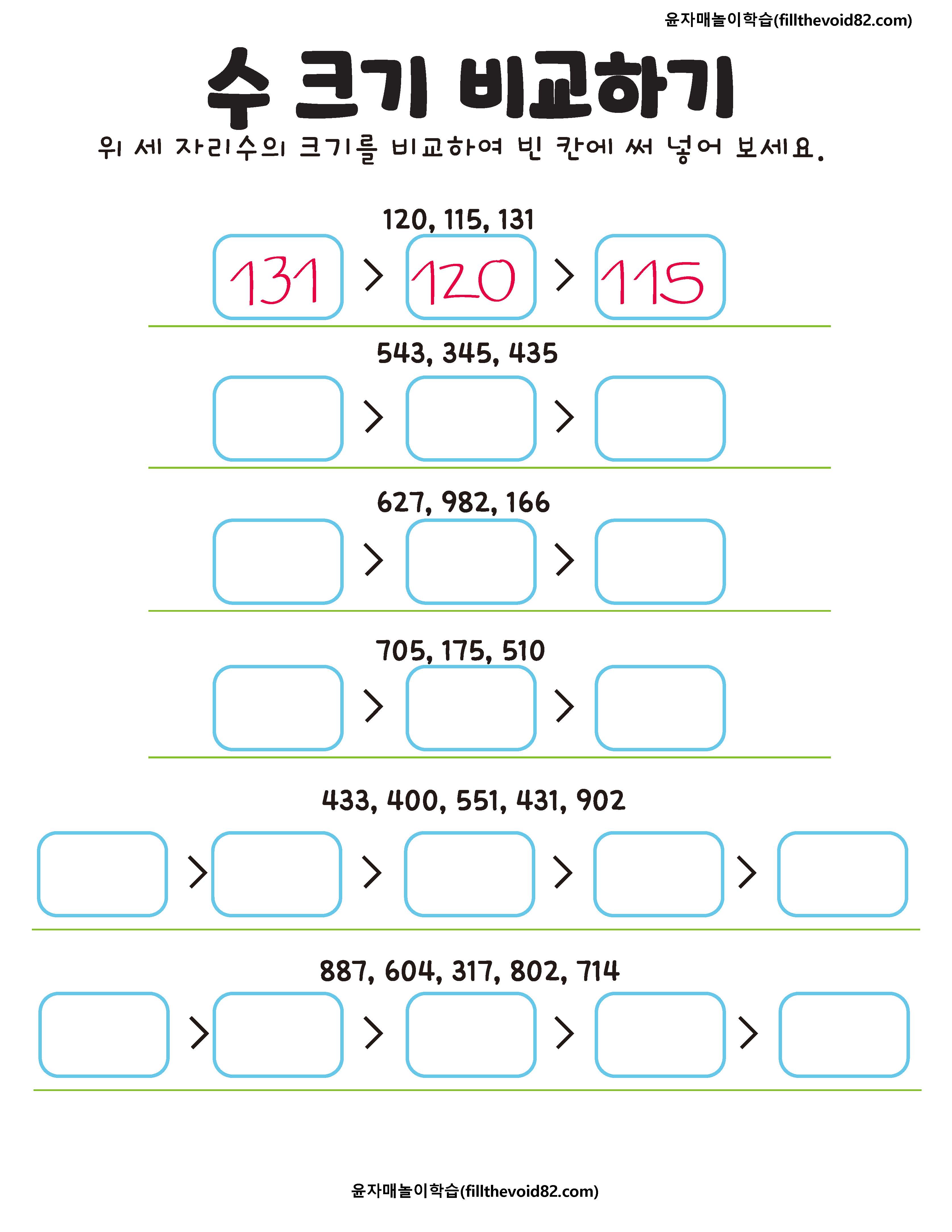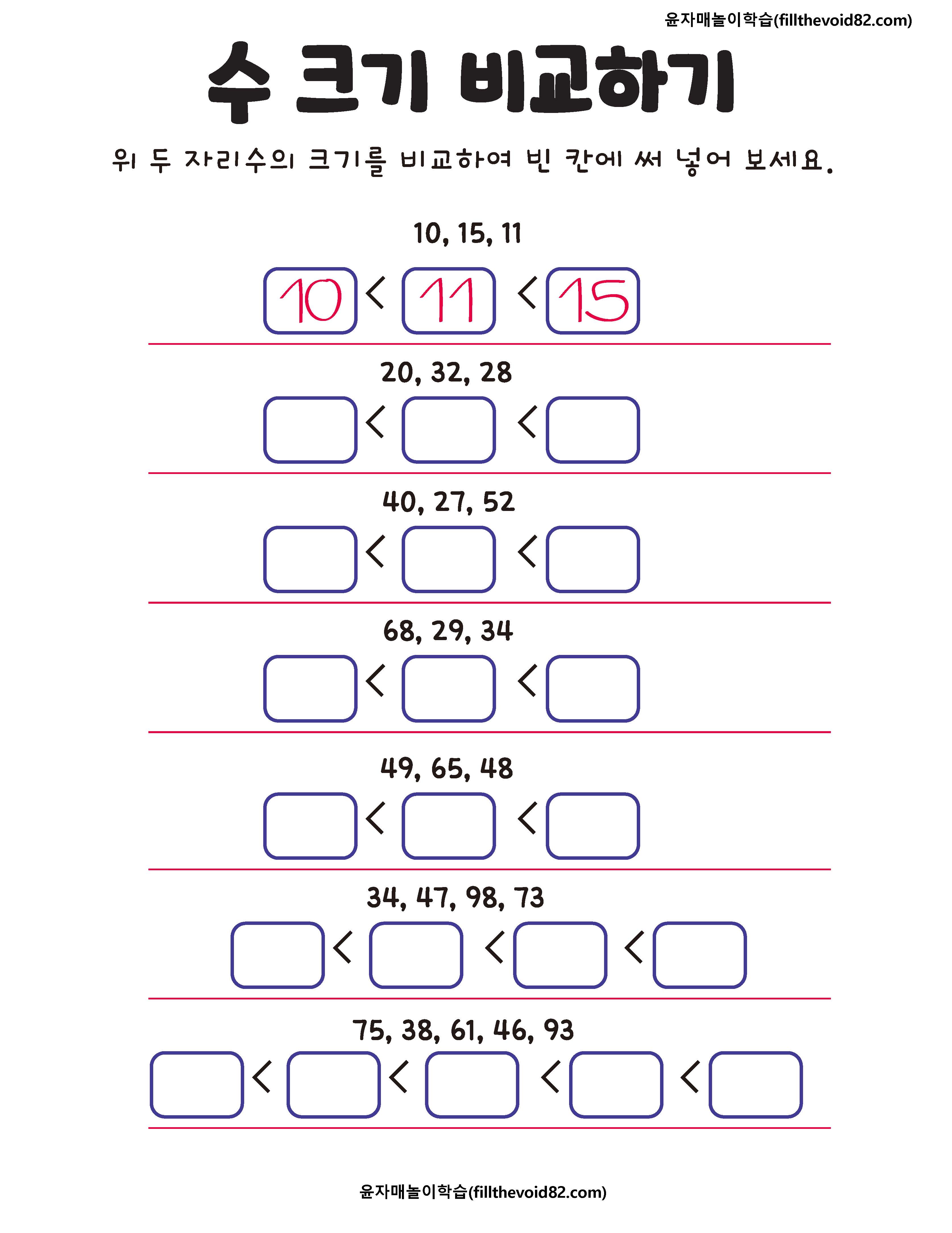 두 자리수, 세 자리수, 네 자리수, 읽기와 크기 비교하기 활동지입니다.