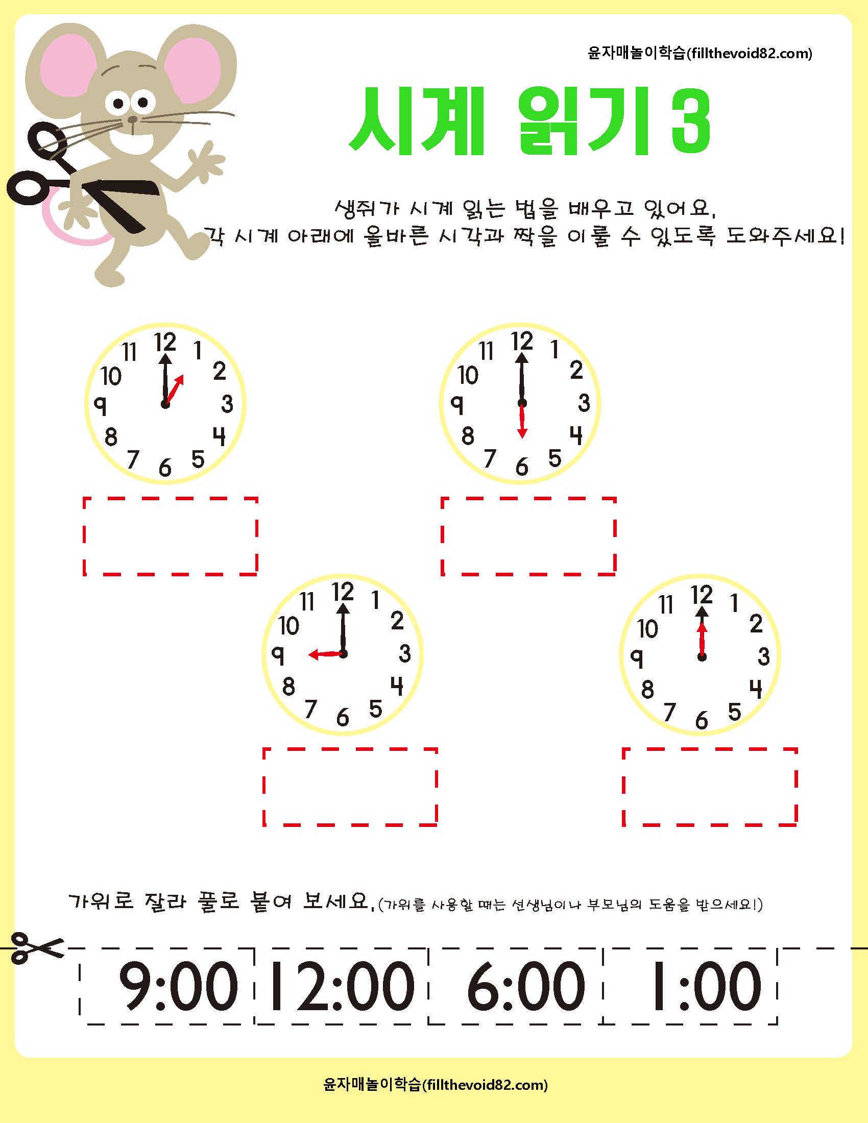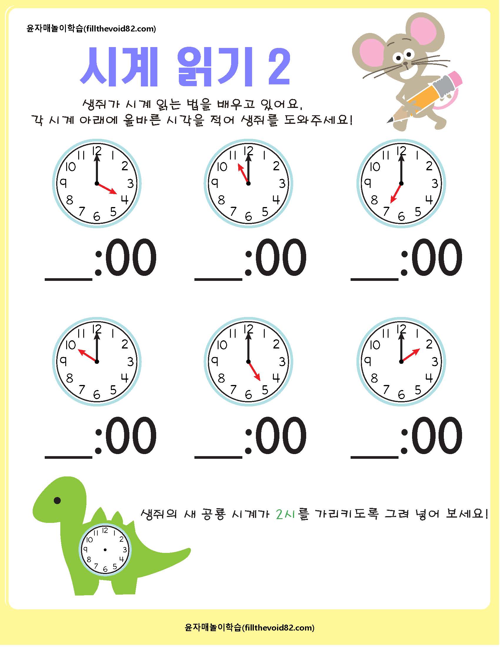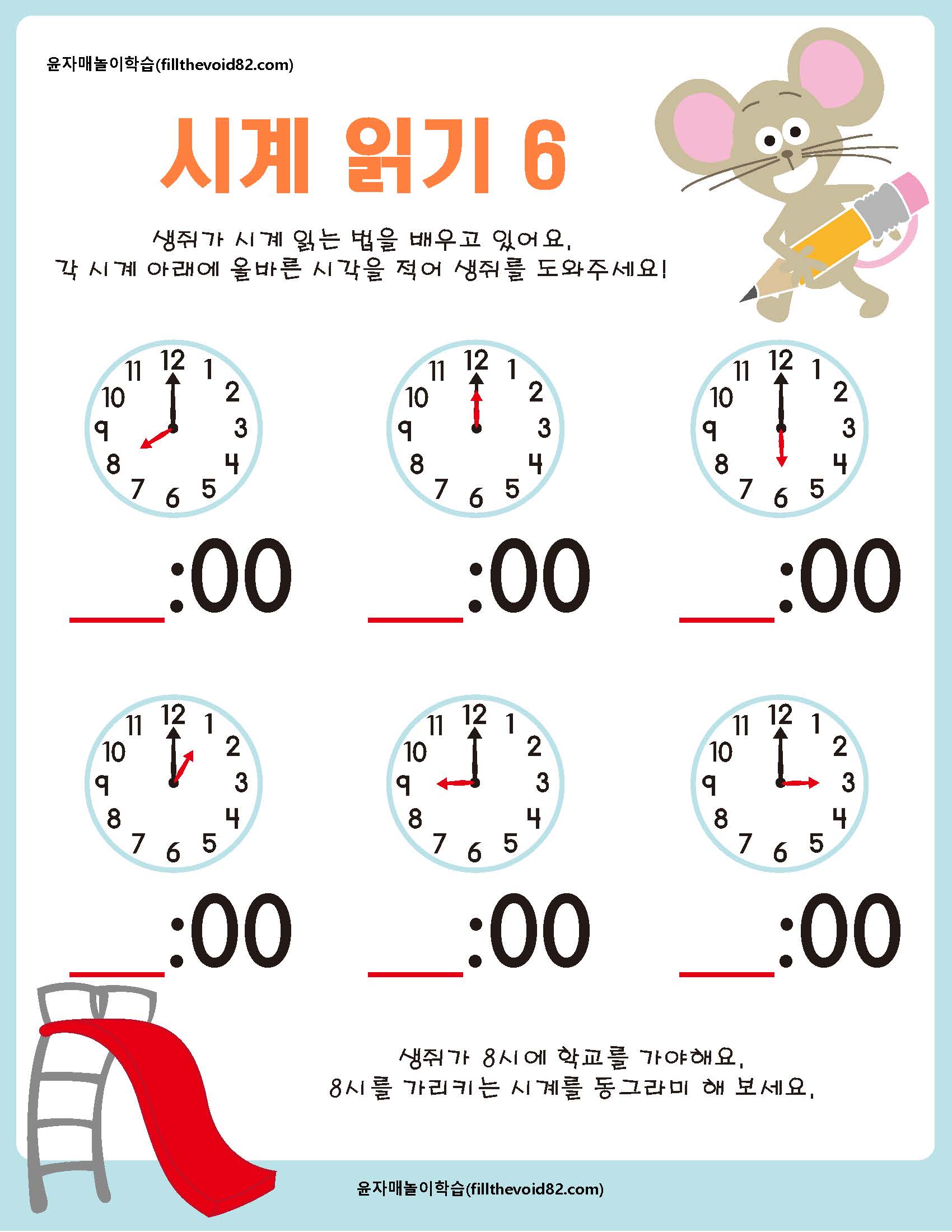 시계보기(정각) 를 익힐 수 있는 활동지입니다.