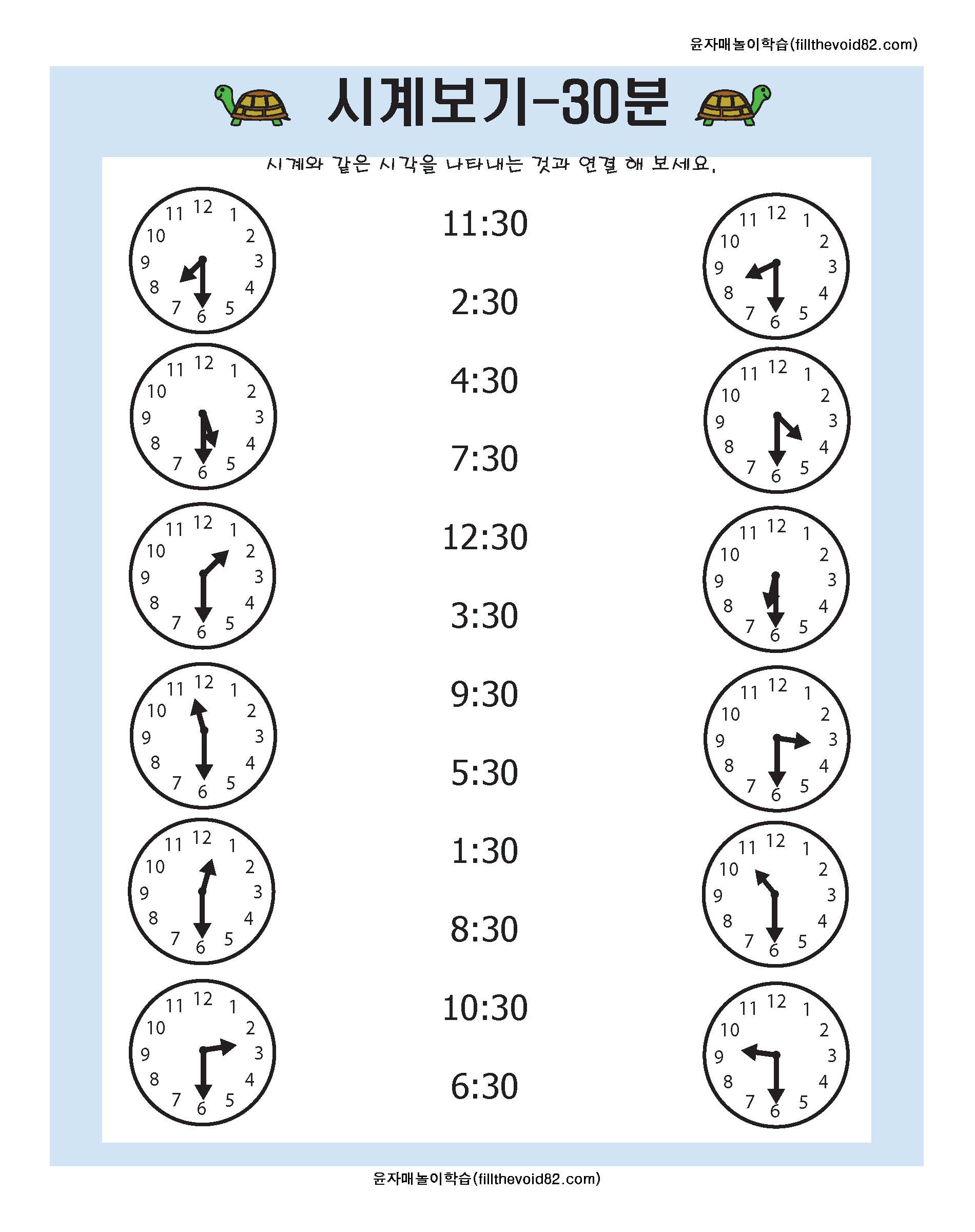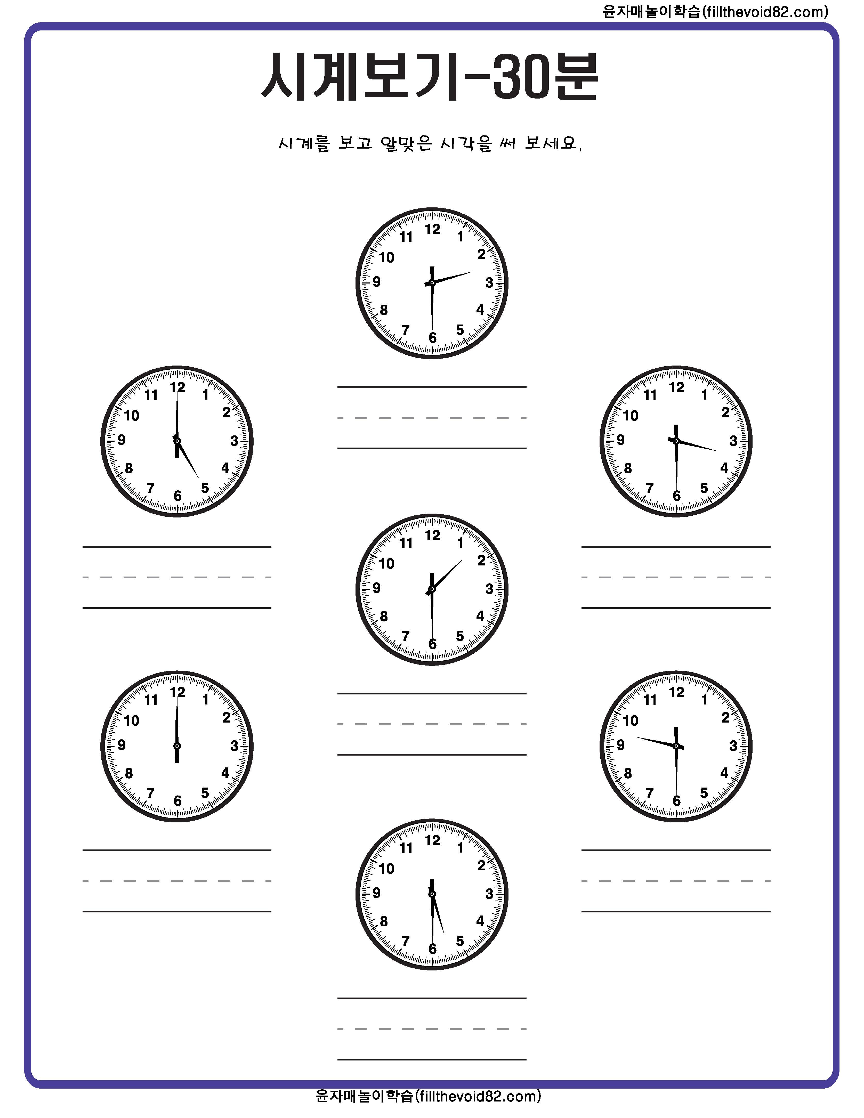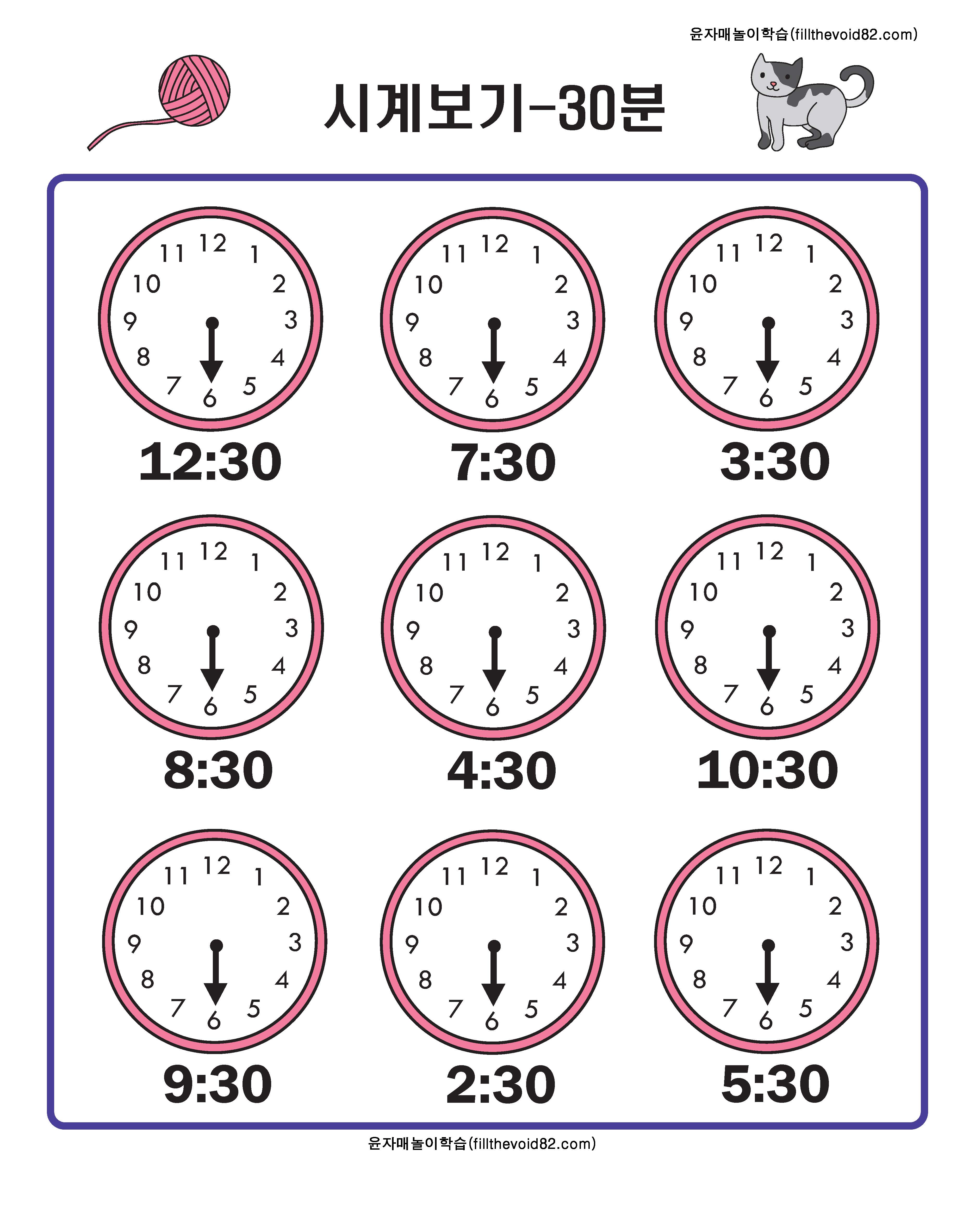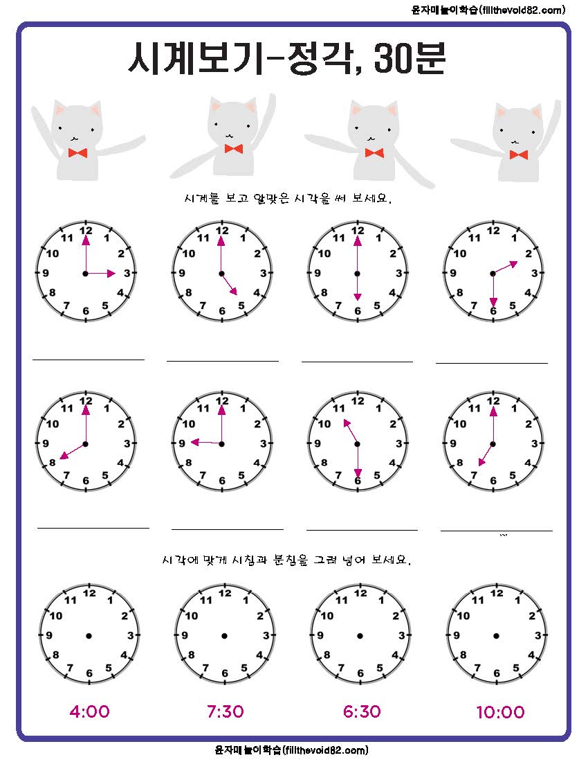 시계보기(정각, 30분)를 학습할 수 있는 활동지입니다.