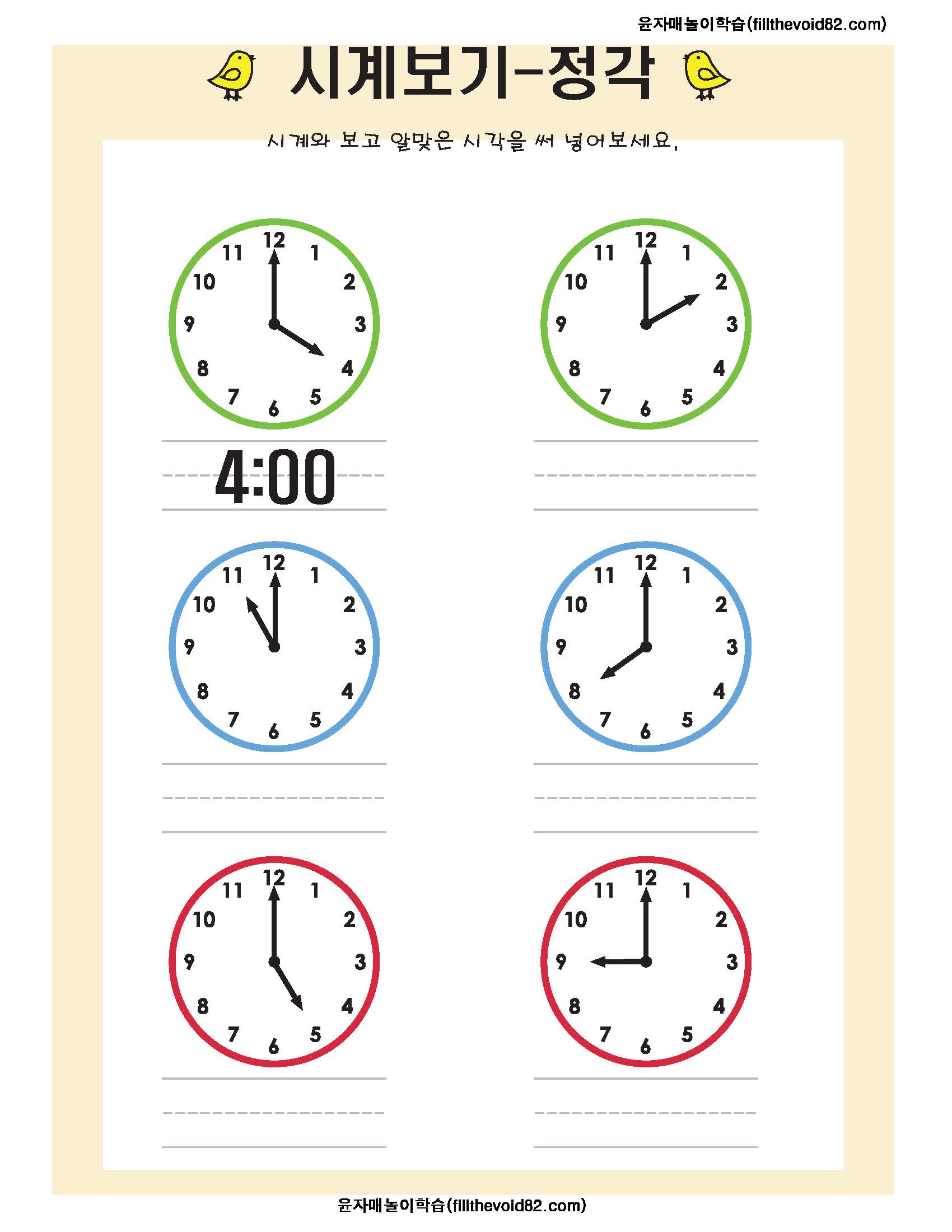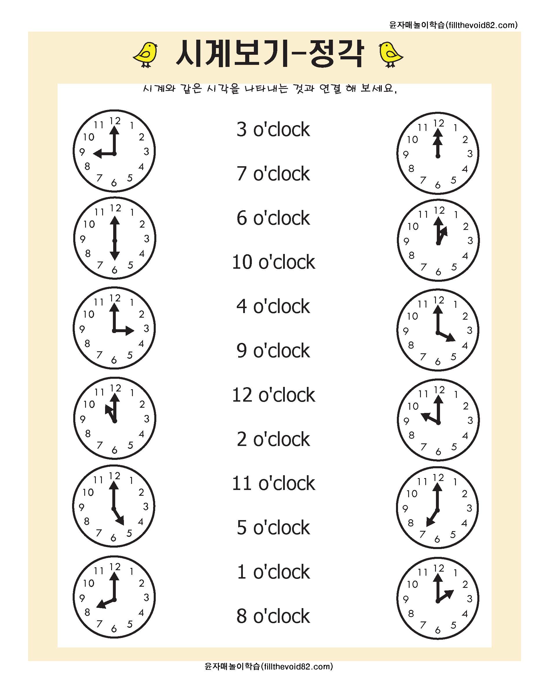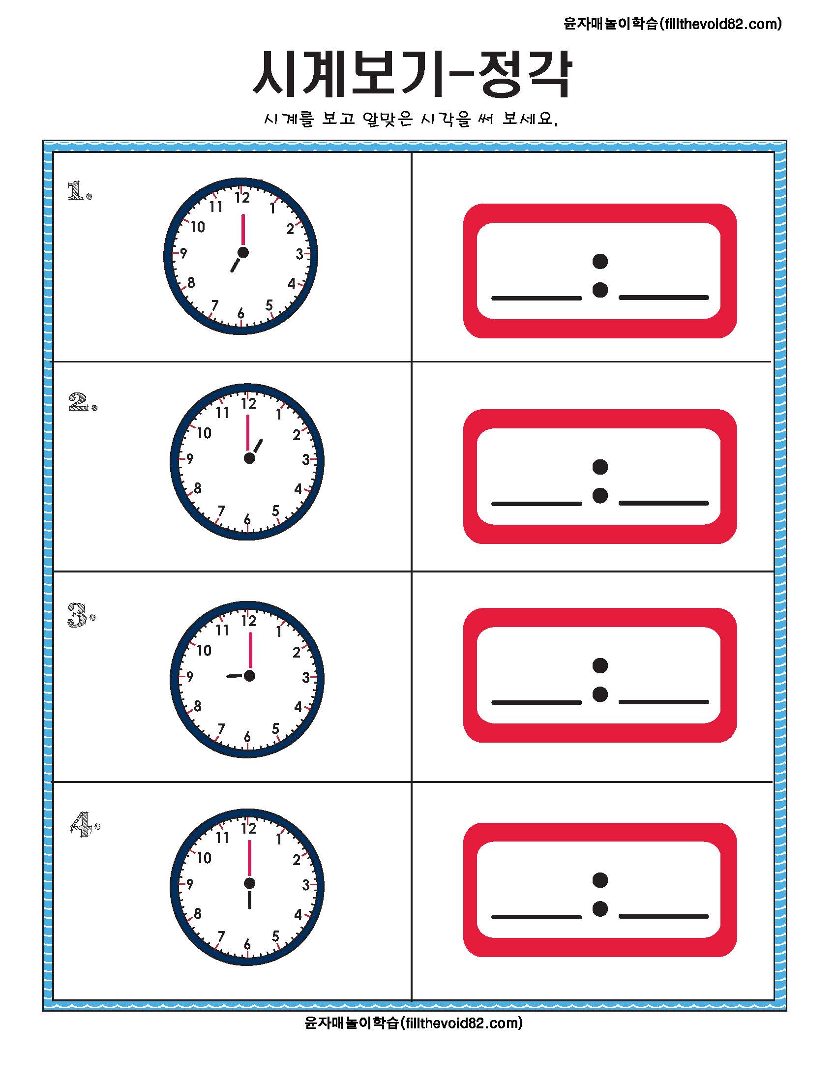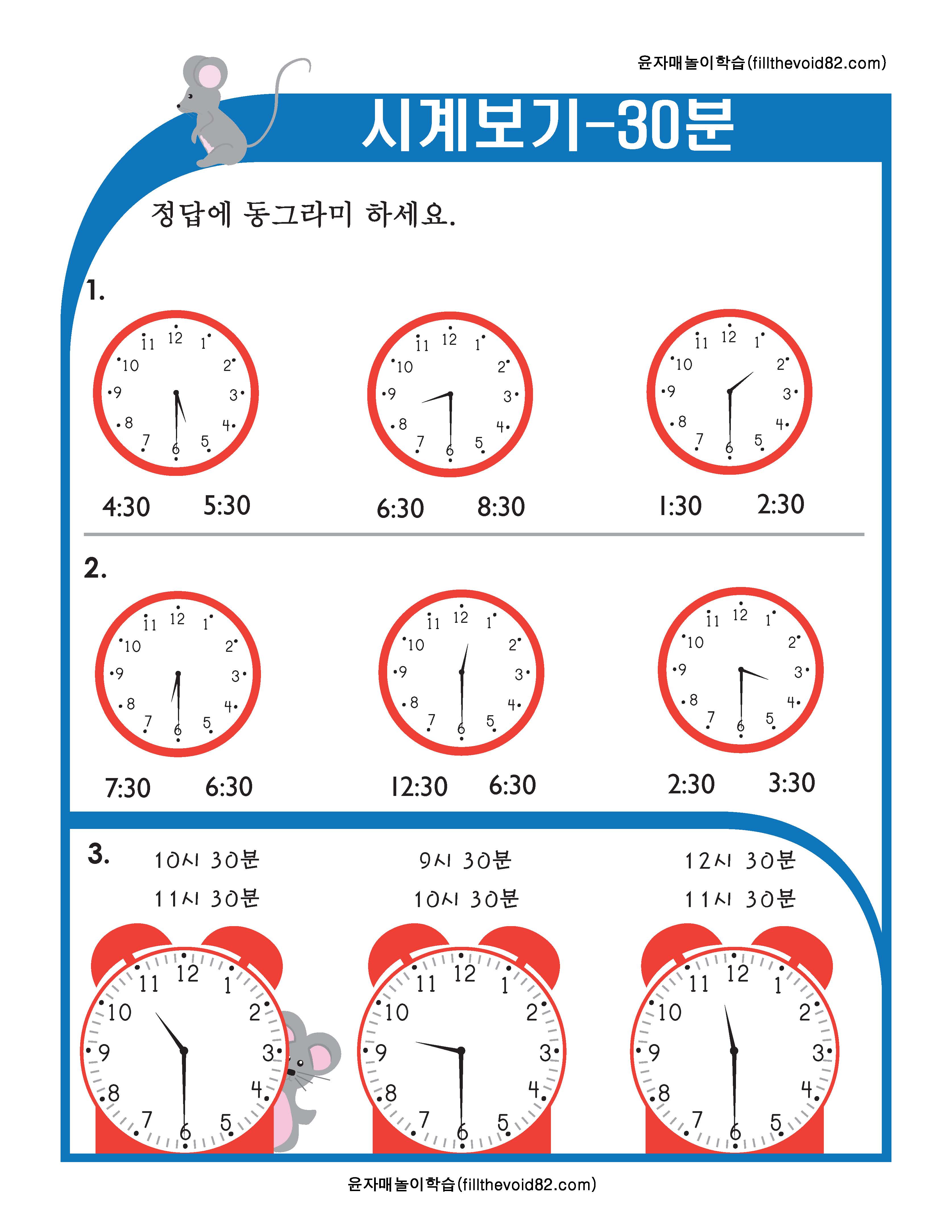 시계보기(정각, 30분)를 학습할 수 있는 활동지입니다.
