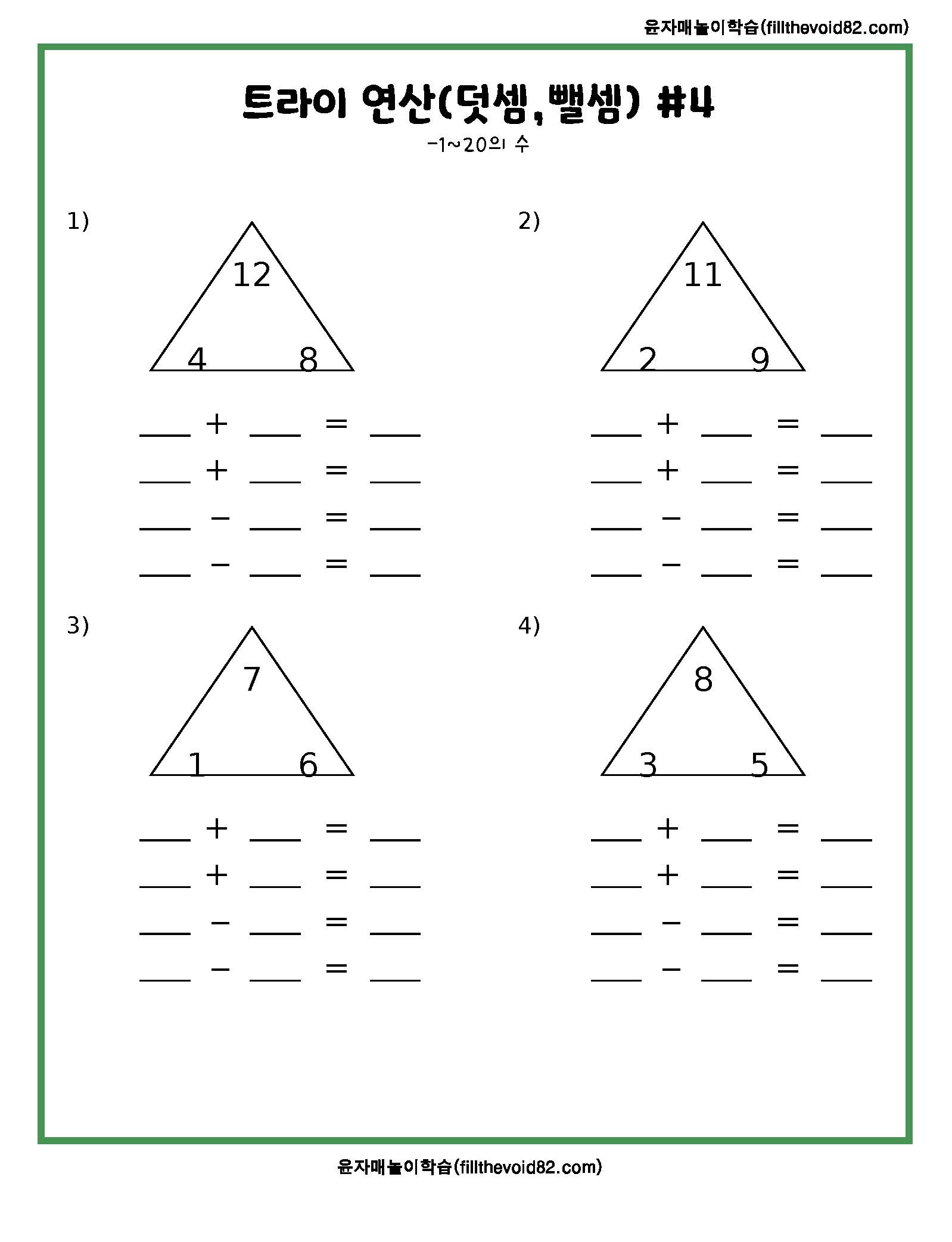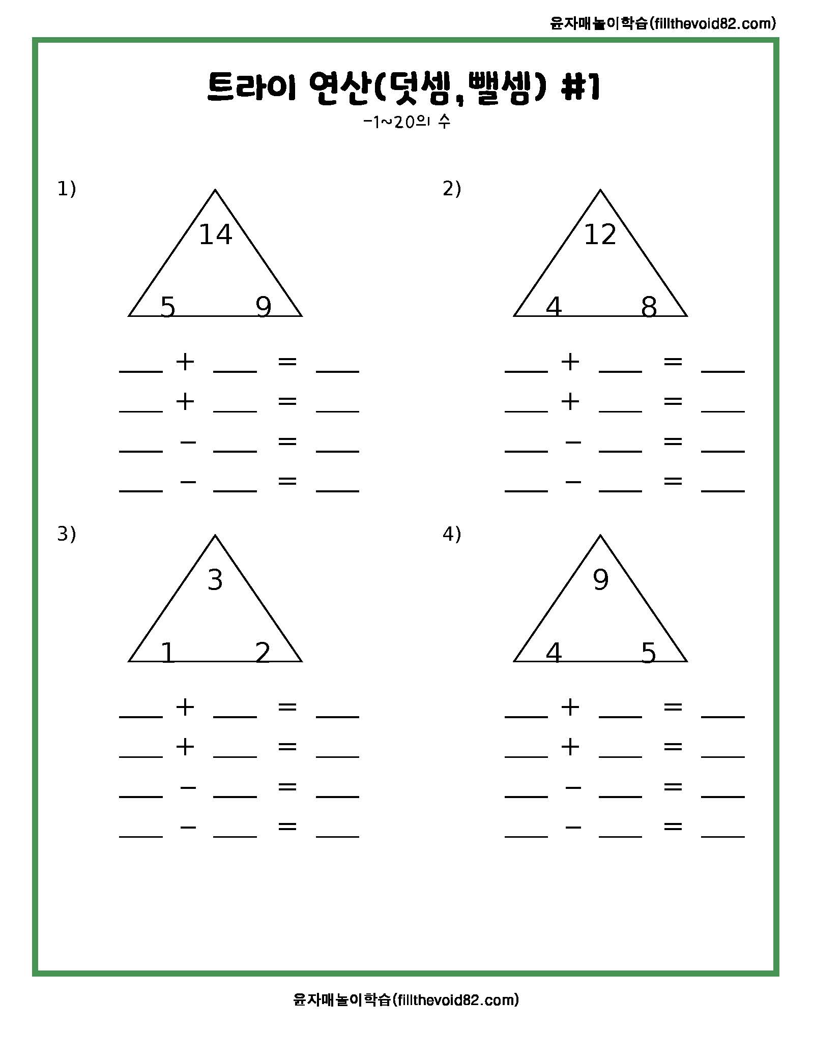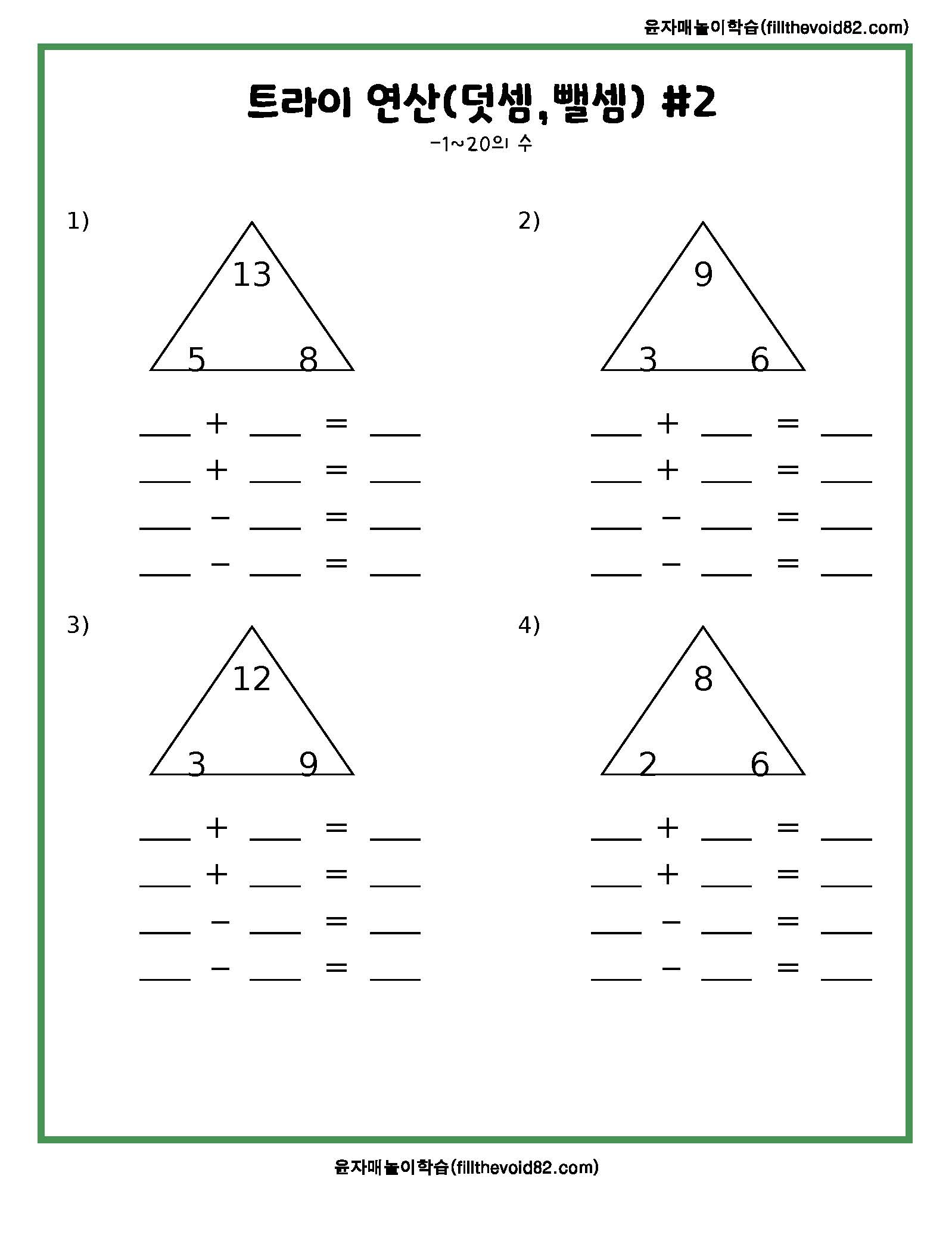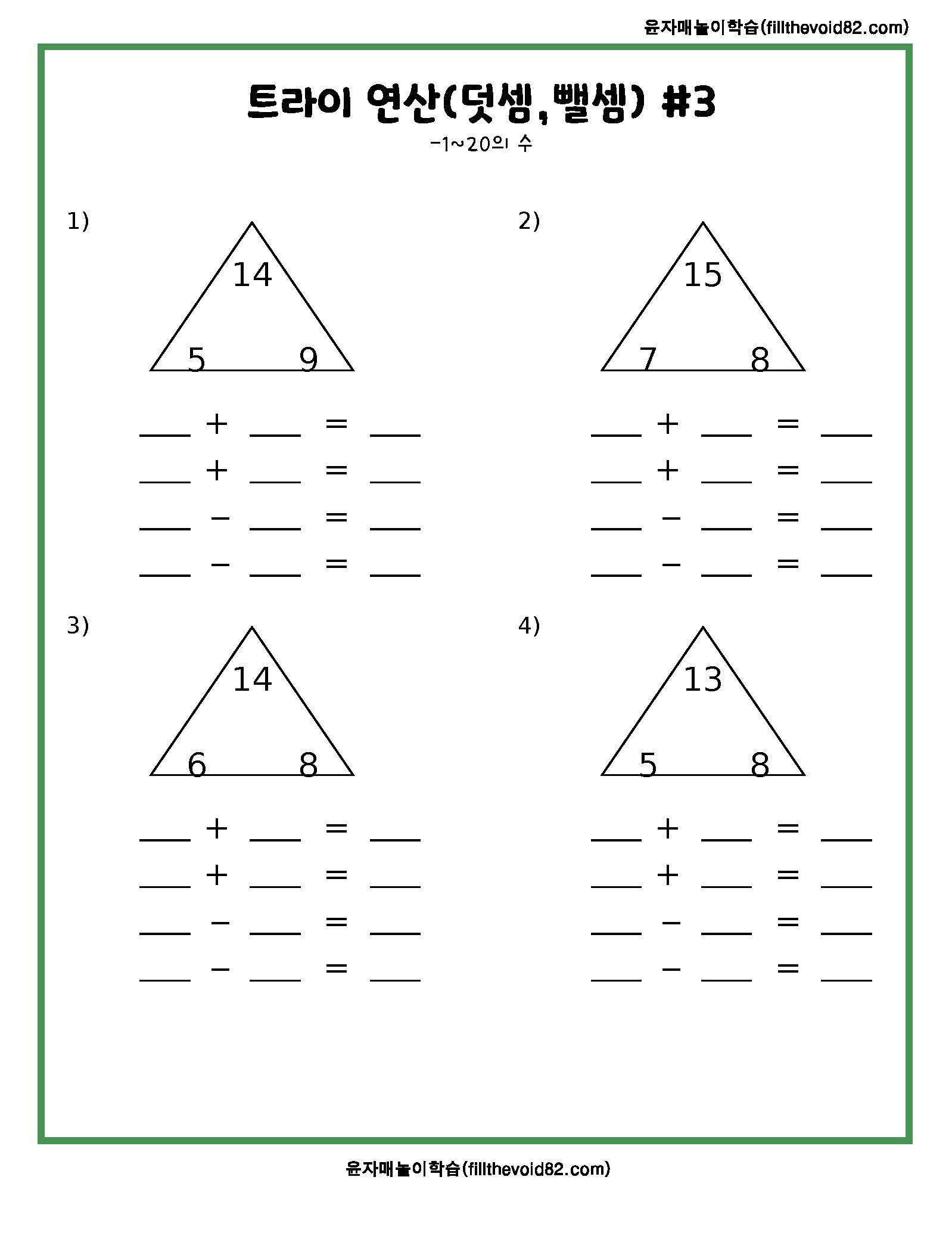 세 수로 덧셈식과, 뺄셈식을 만들어 보는 연산 학습지입니다.