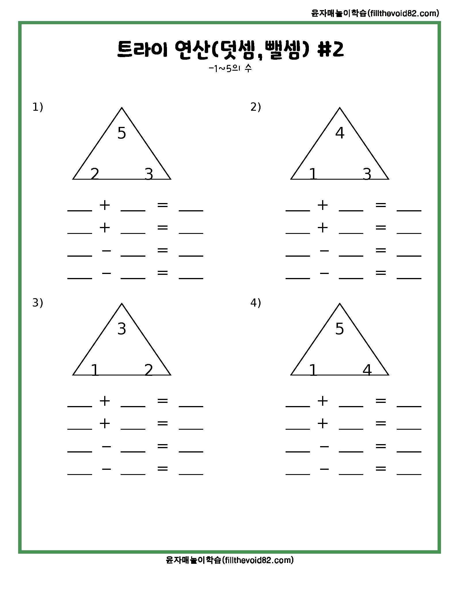 세 수로 덧셈식과, 뺄셈식을 만들어 보는 연산 학습지입니다.