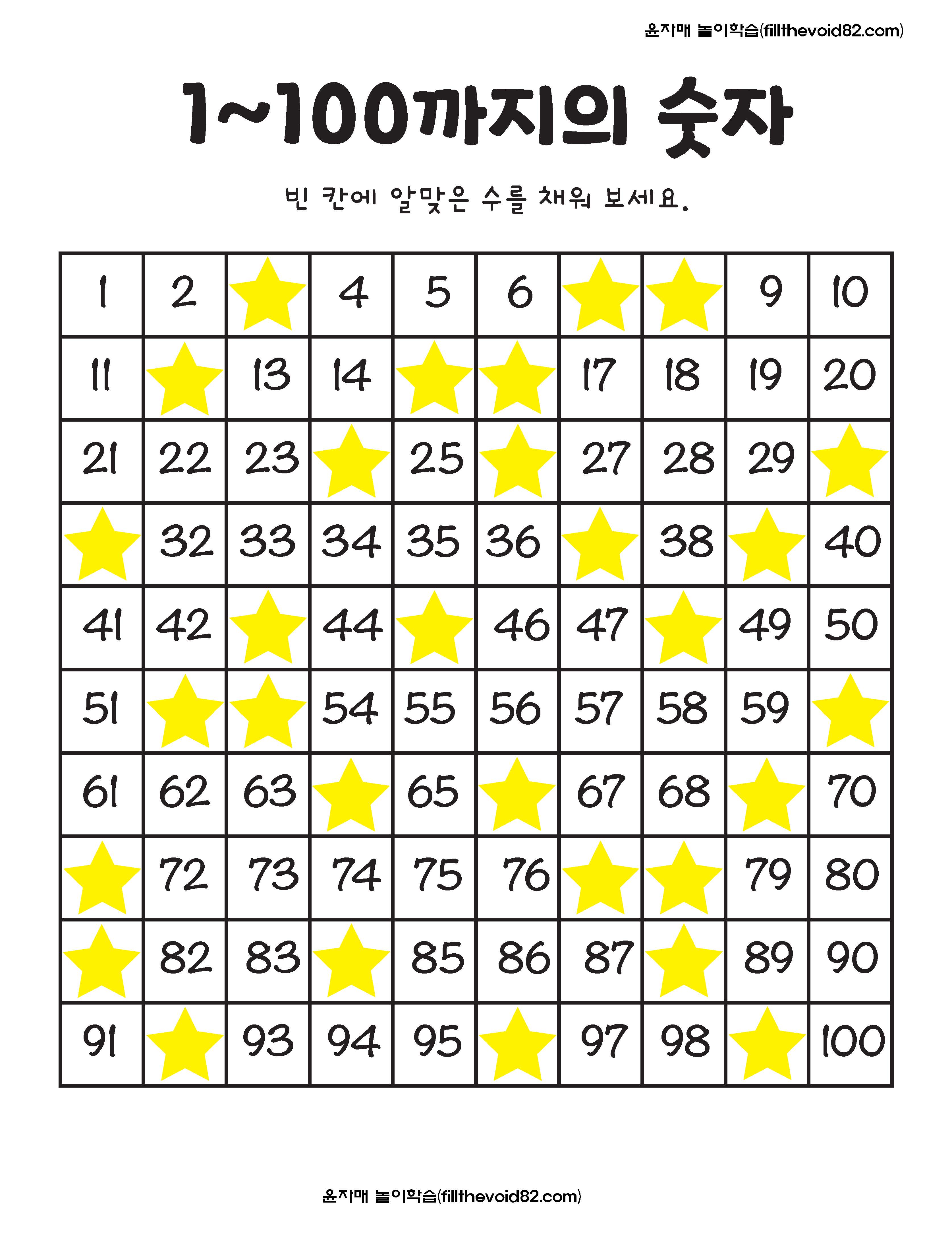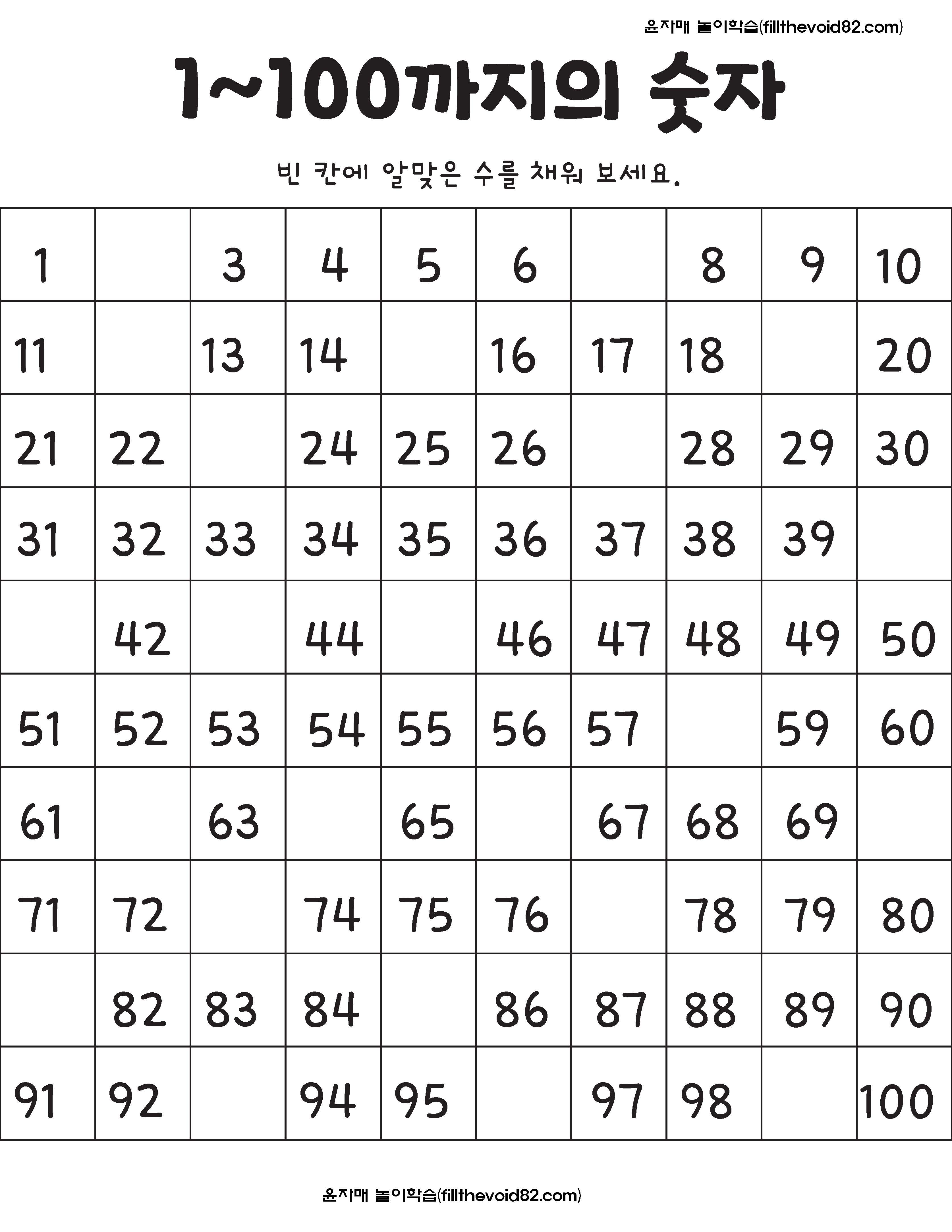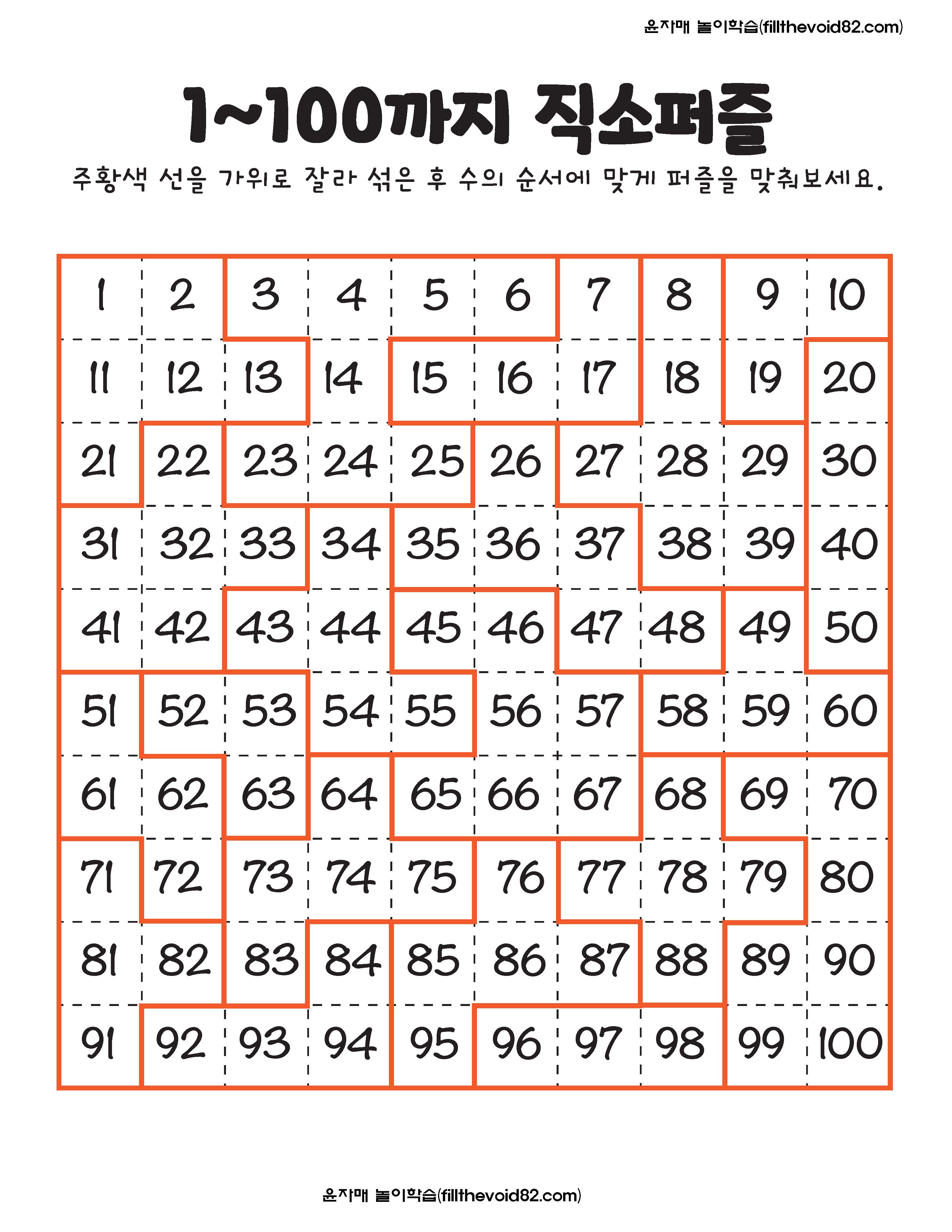 100까지의 수를 익힐 수 있는 여러가지 활동지입니다. (수배열판)