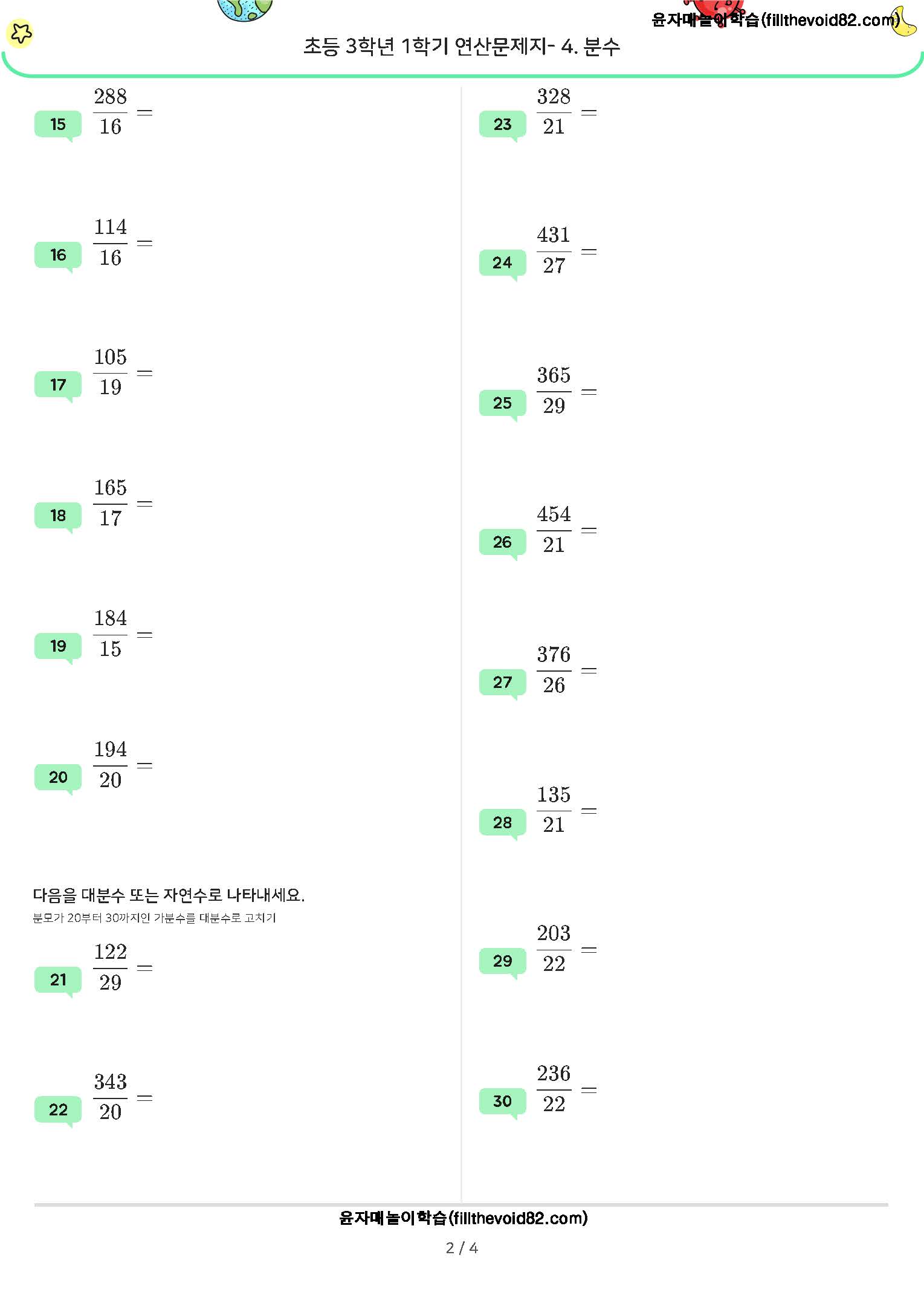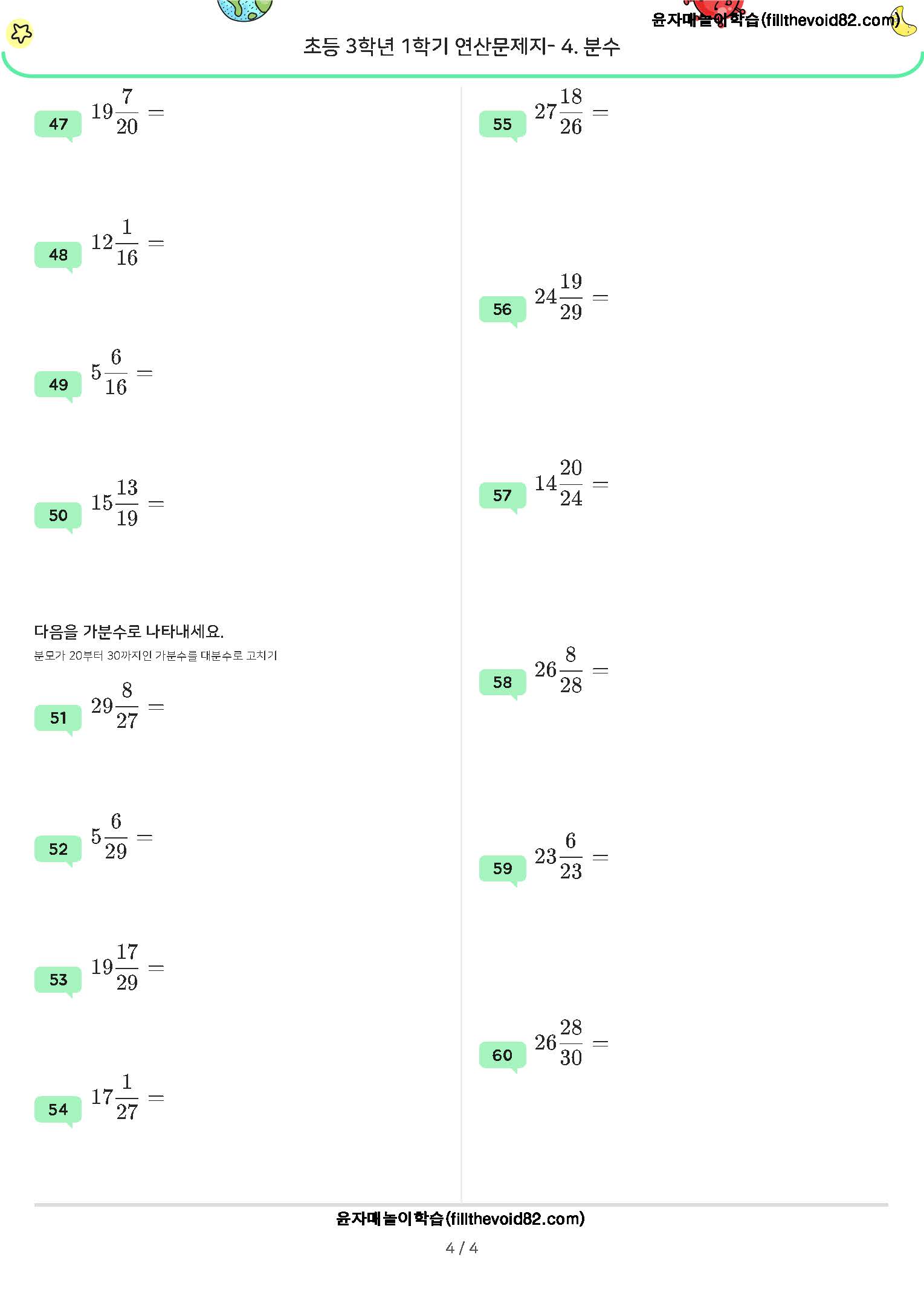 가분수를 대분수로 대분수를 가분수로 바꾸는 연습을 할 수 있는 연산문제지입니다. 총 60문제입니다.