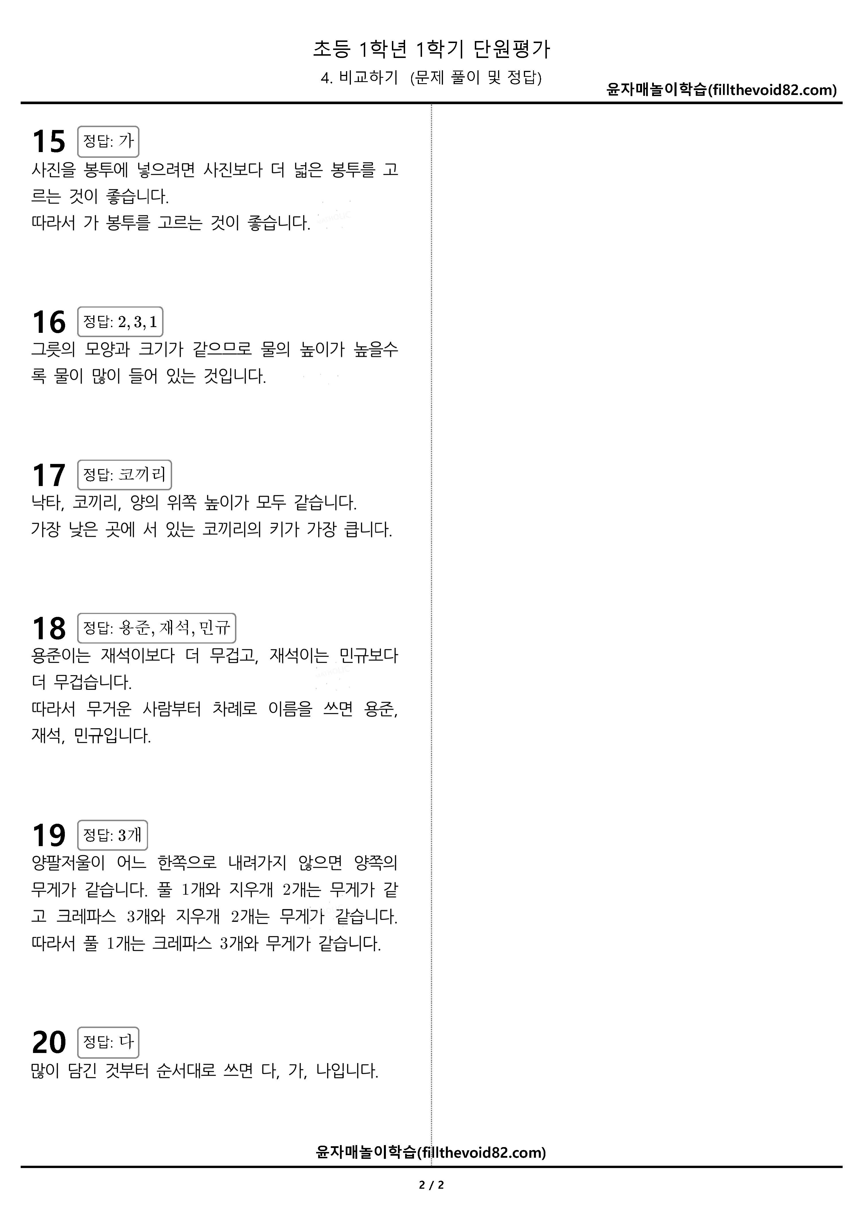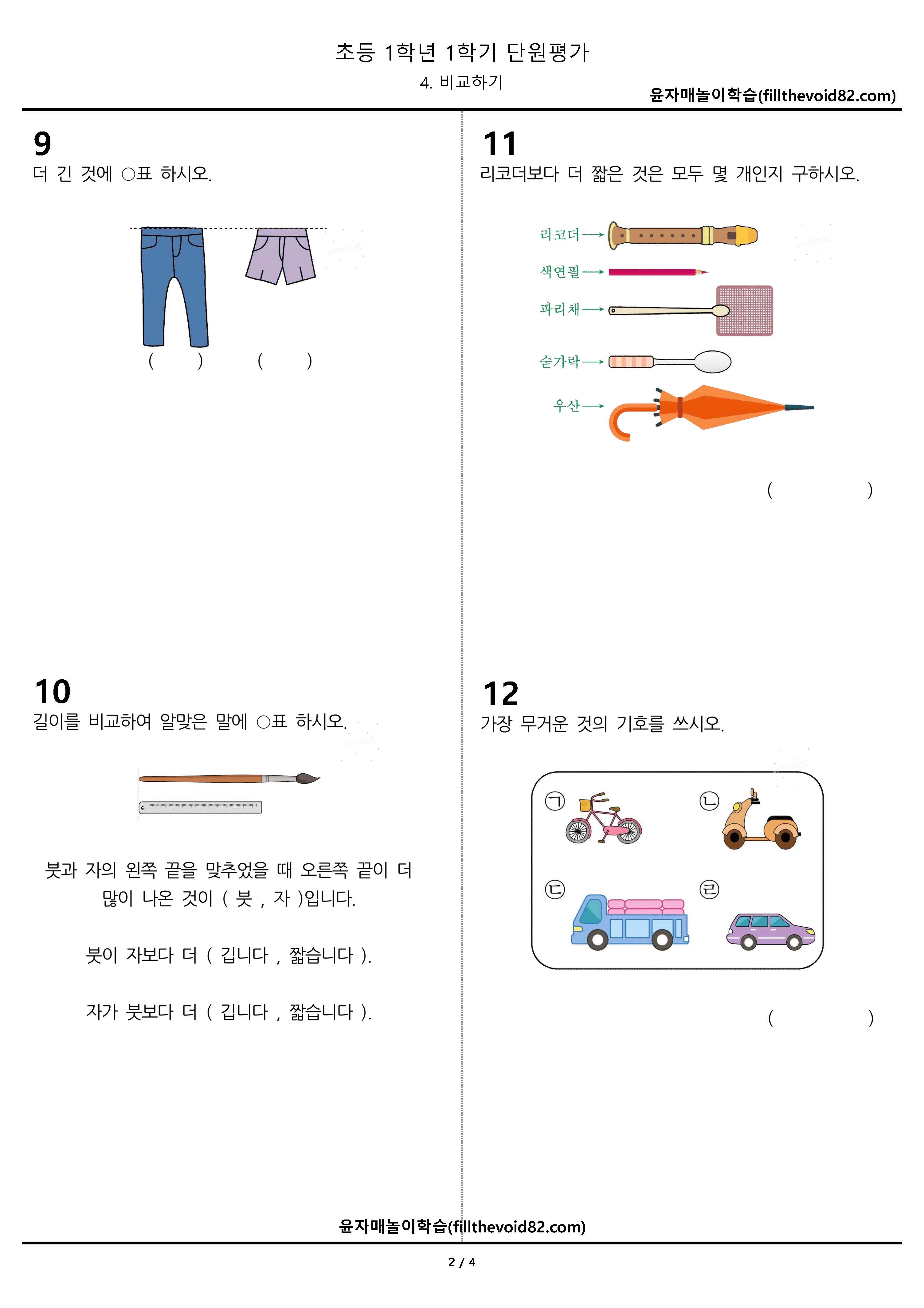 무료학습지) 초1 단원평가) 1학년 1학기-4. 비교하기