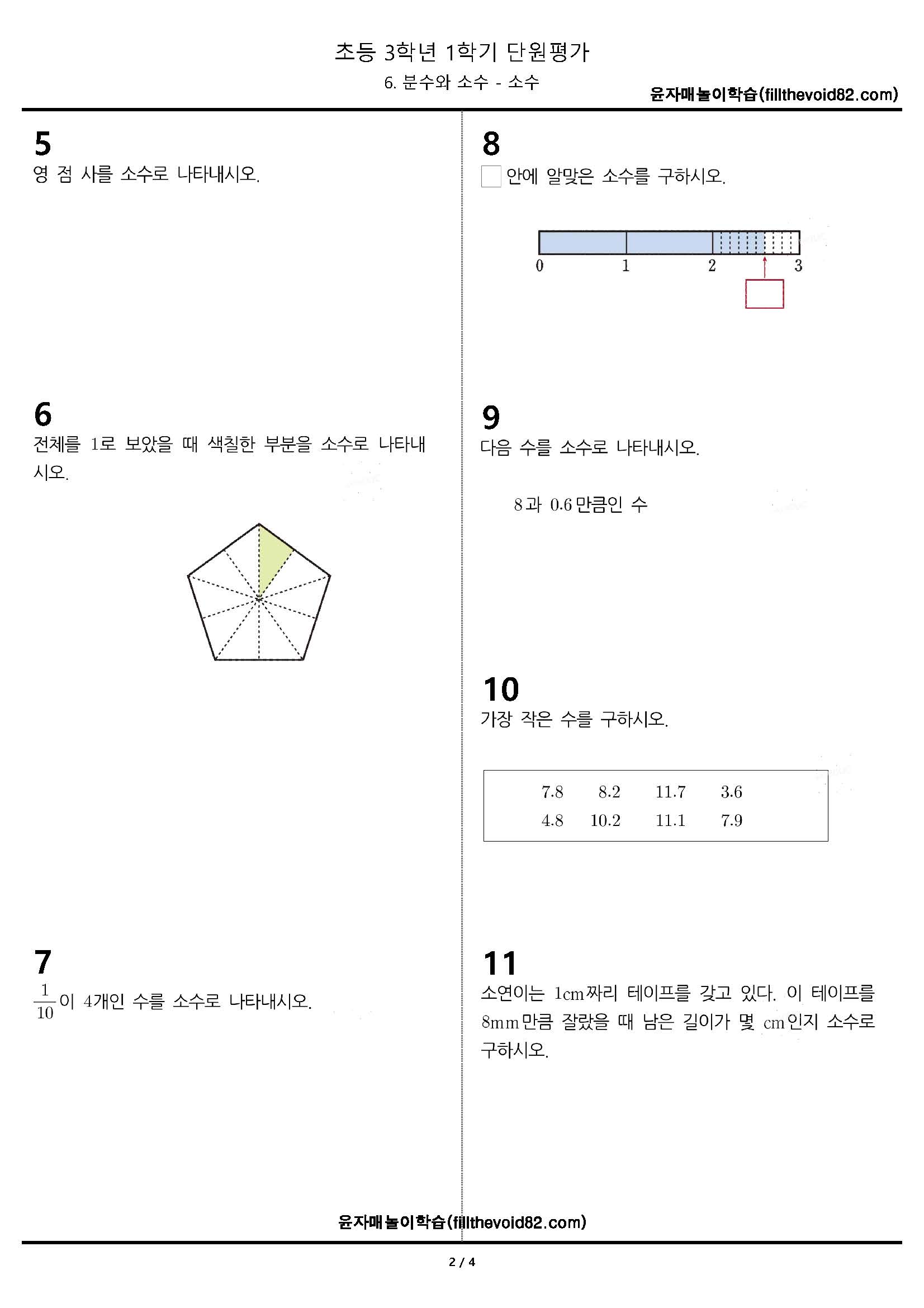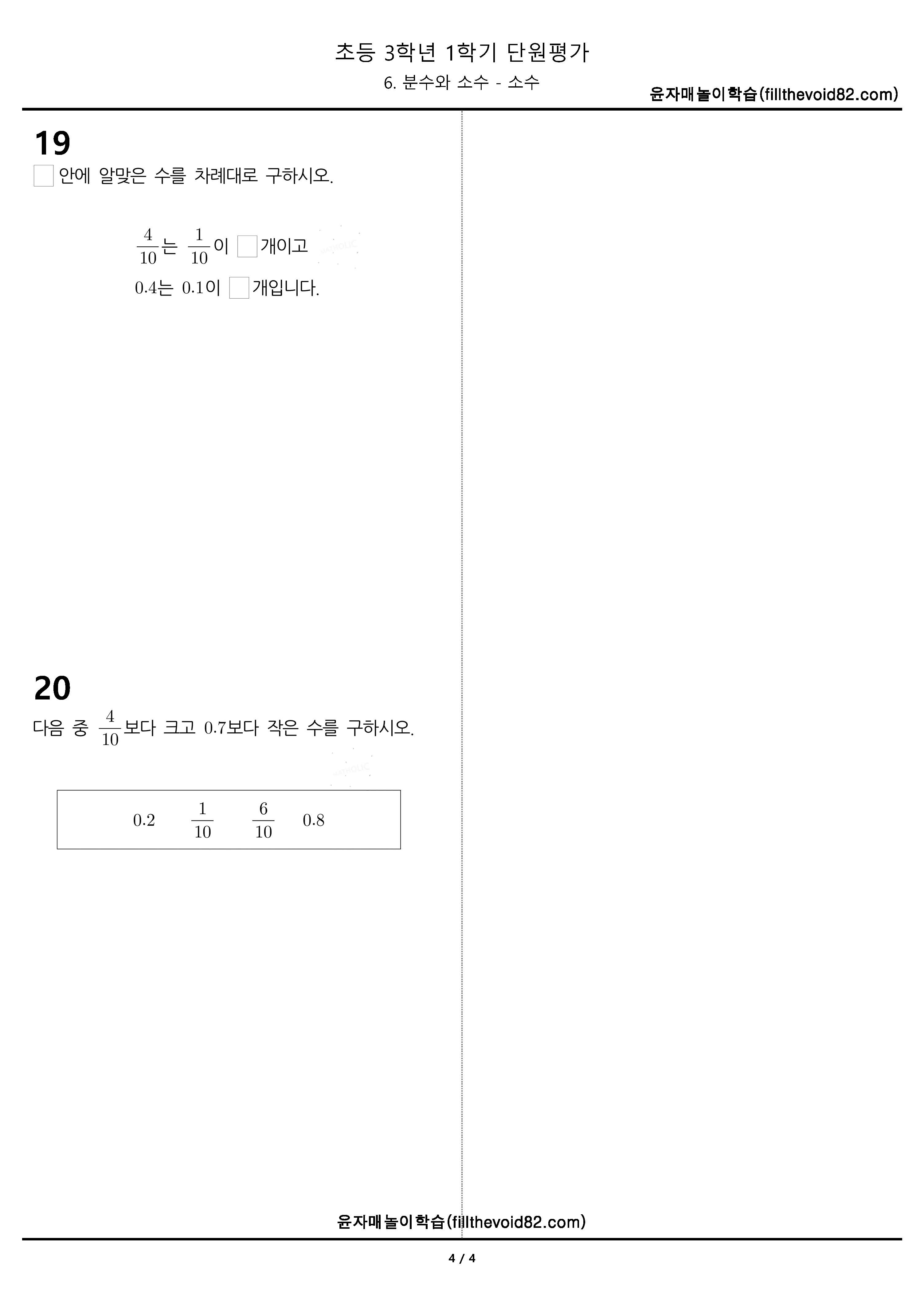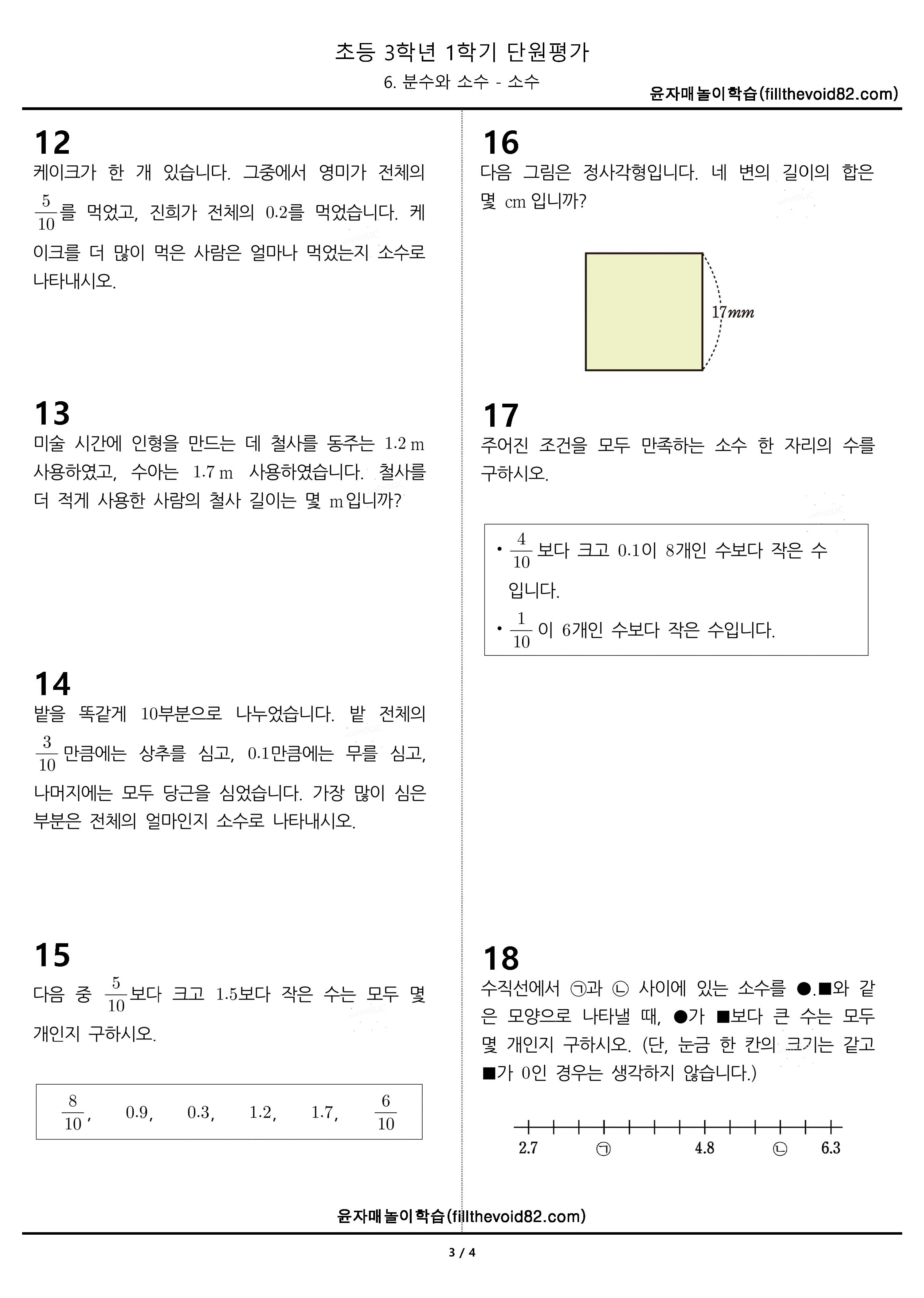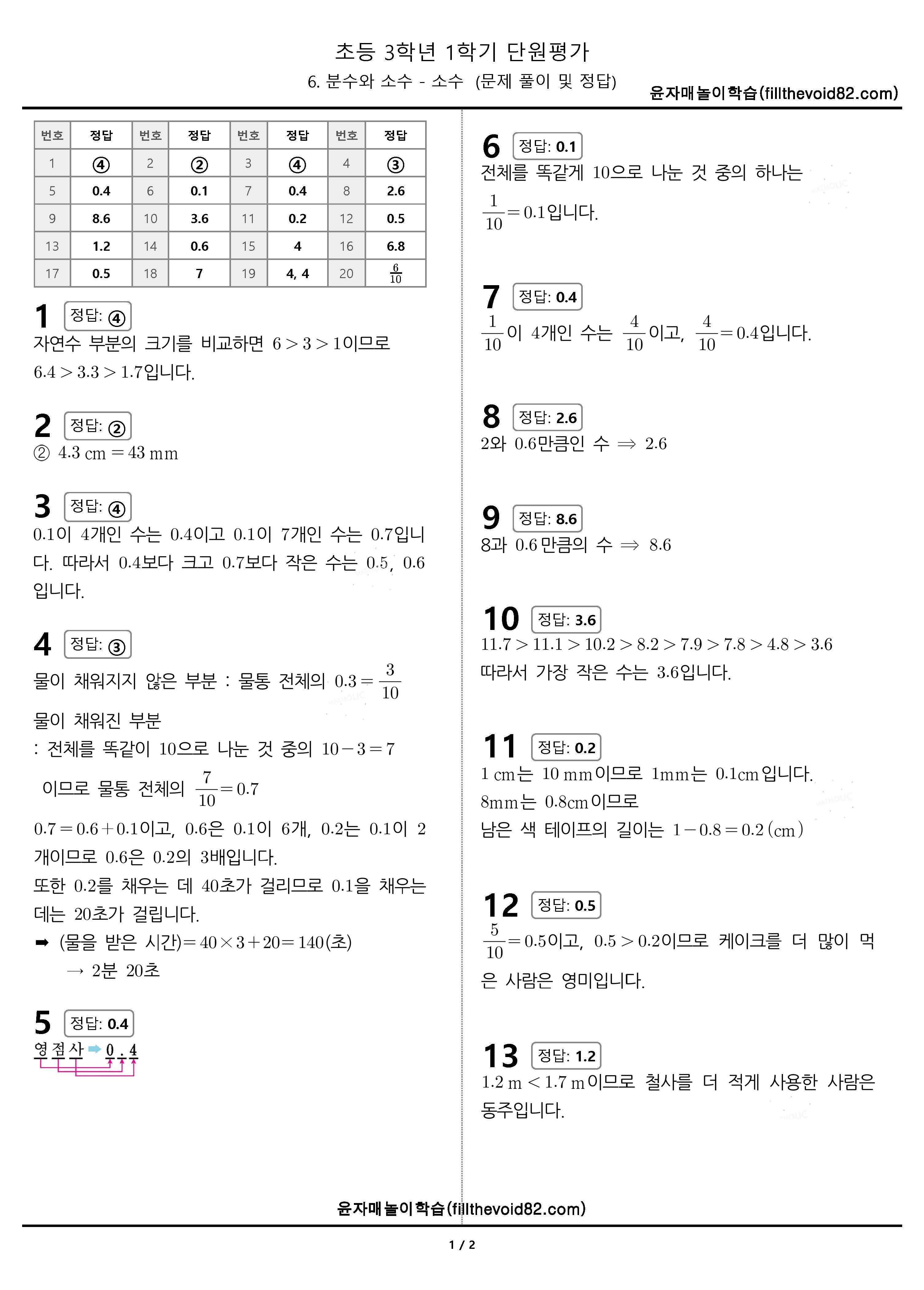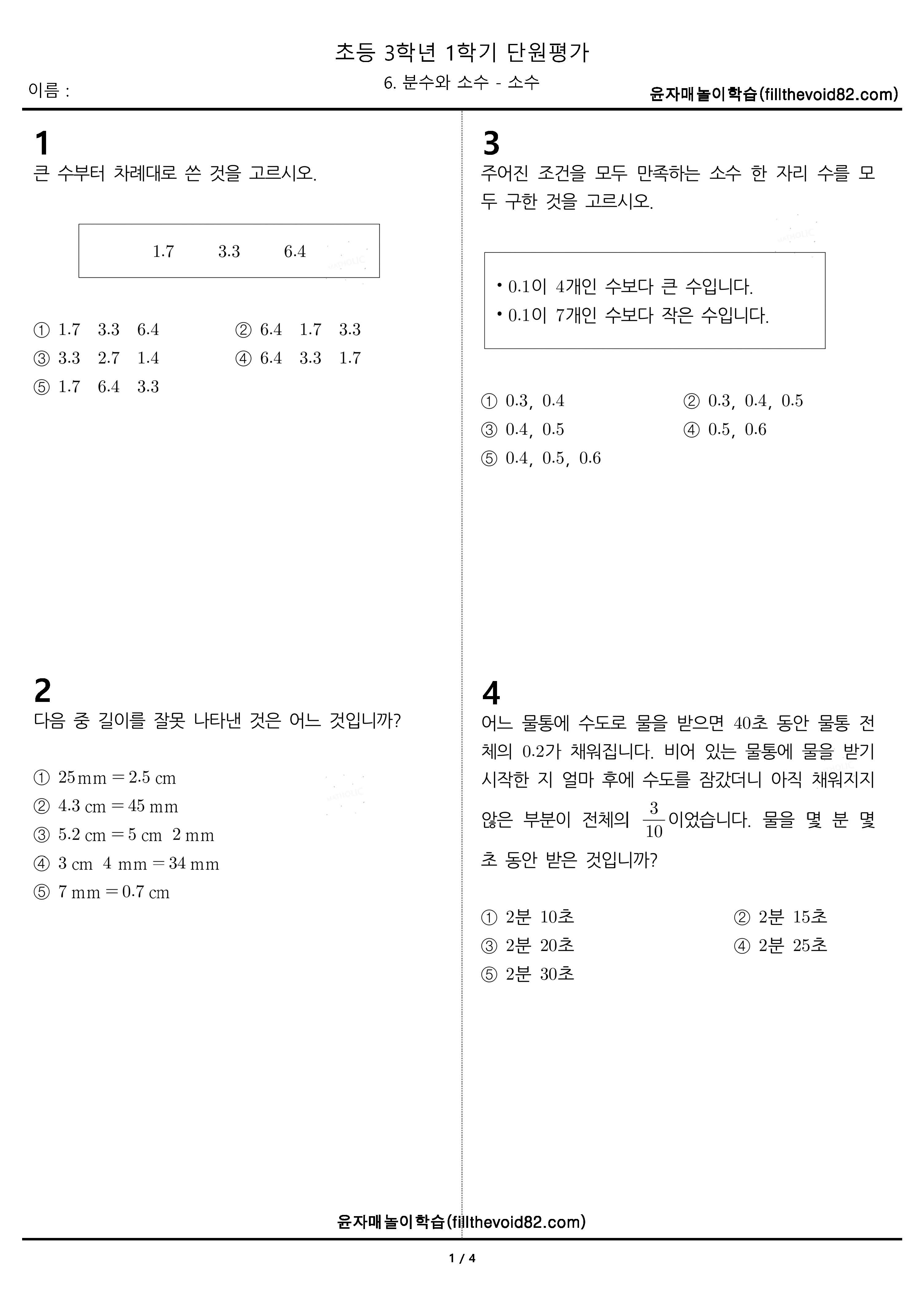 | 무료학습지) 초3 단원평가) 3학년 1학기 단원평가-6. 분수와 소수(분수) (0) | 2023.04.10 |